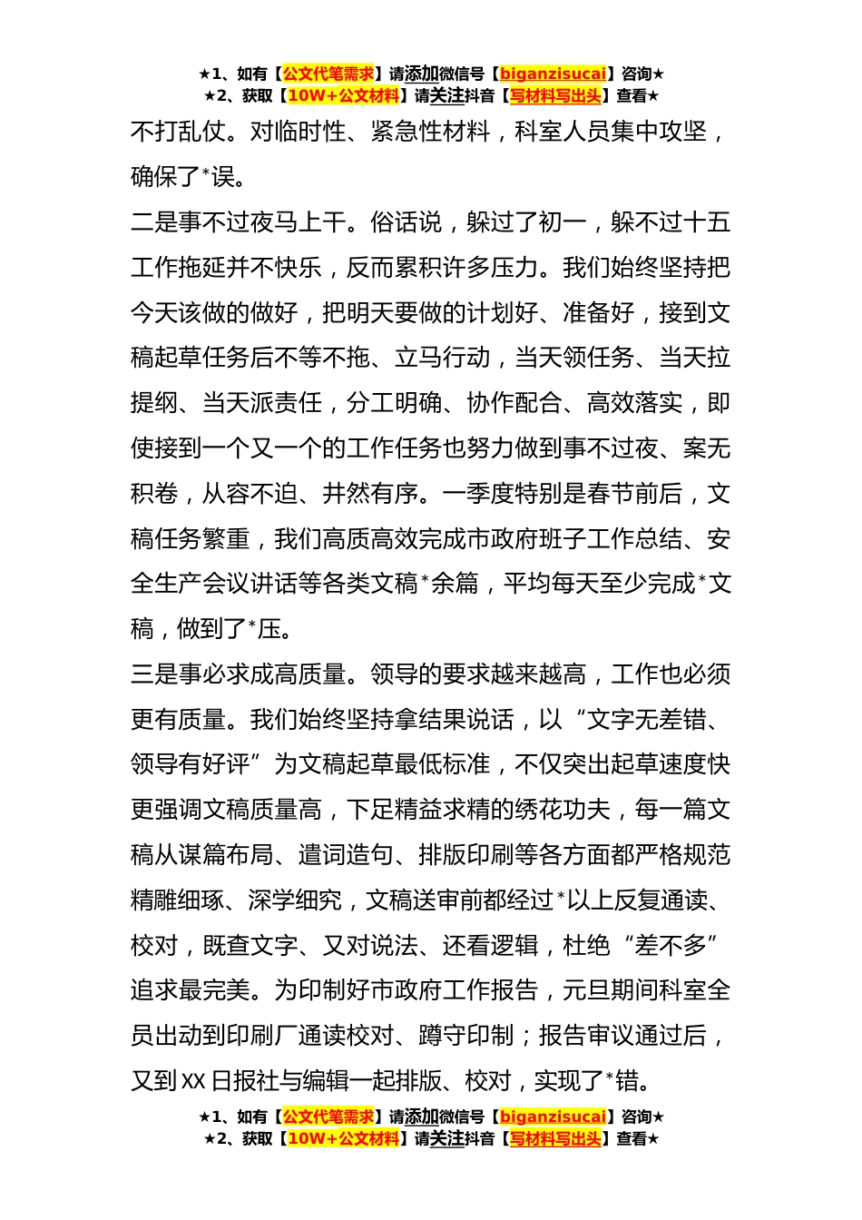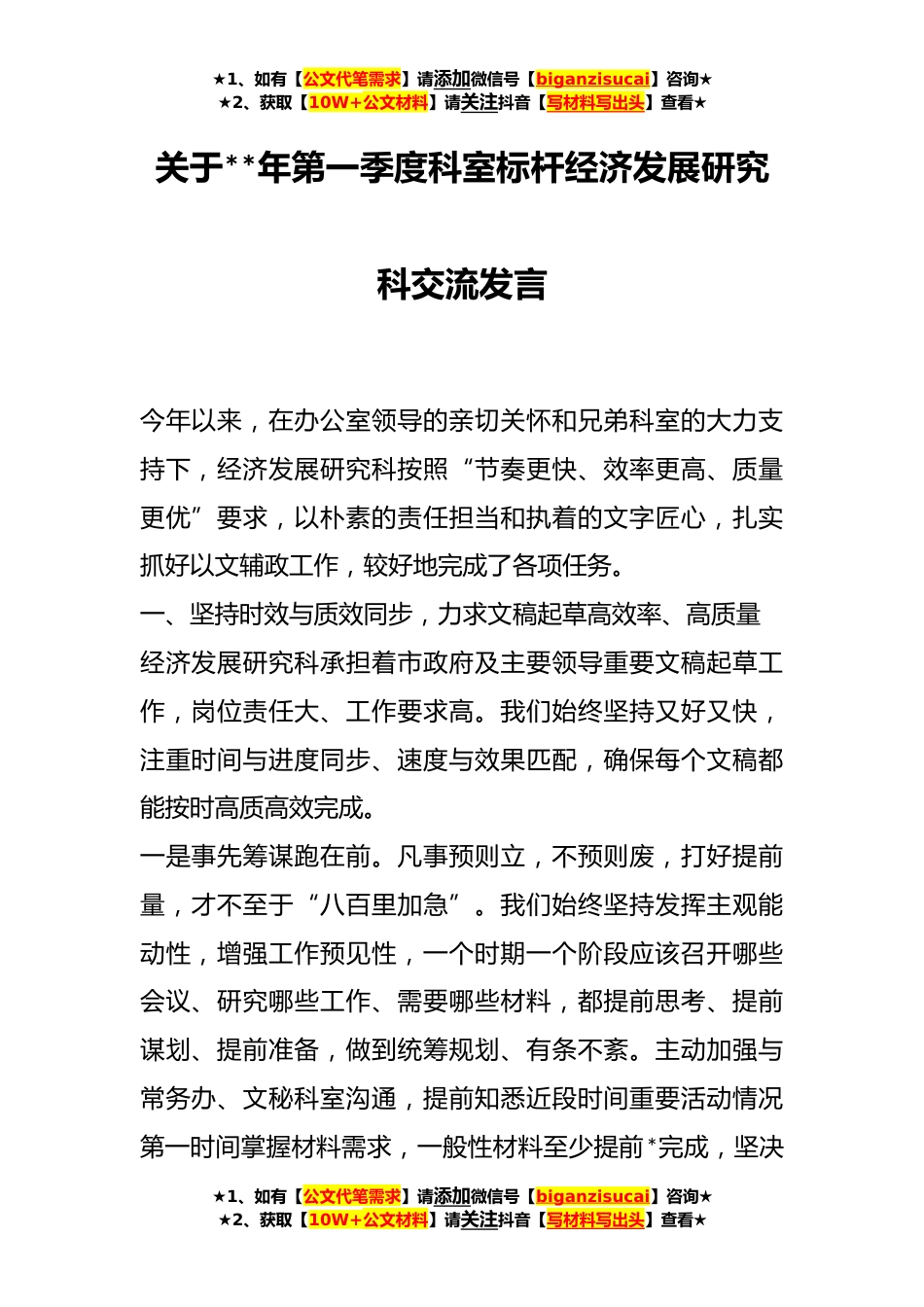 ★1、如有【公文代笔需求】请添加微信号【biganzisucai】咨询★★2、获取【10W+公文材料】请关注抖音【写材料写出头】查看★关于**年第一季度科室标杆经济发展研究科交流发言今年以来,在办公室领导的亲切关怀和兄弟科室的大力支持下,经济发展研究科按照“节奏更快、效率更高、质量更优”要求,以朴素的责任担当和执着的文字匠心,扎实抓好以文辅政工作,较好地完成了各项任务。一、坚持时效与质效同步,力求文稿起草高效率、高质量经济发展研究科承担着市政府及主要领导重要文稿起草工作,岗位责任大、工作要求高。我们始终坚持又好又快,注重时间与进度同步、速度与效果匹配,确保每个文稿都能按时高质高效完成。一是事先筹谋跑在前。凡事预则立,不预则废,打好提前量,才不至于“八百里加急”。我们始终坚持...