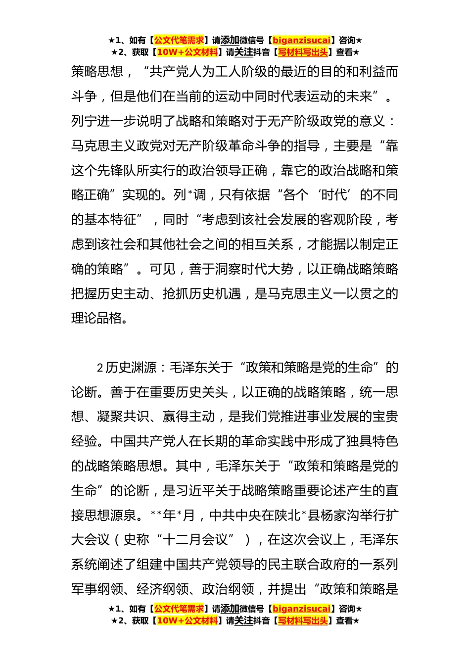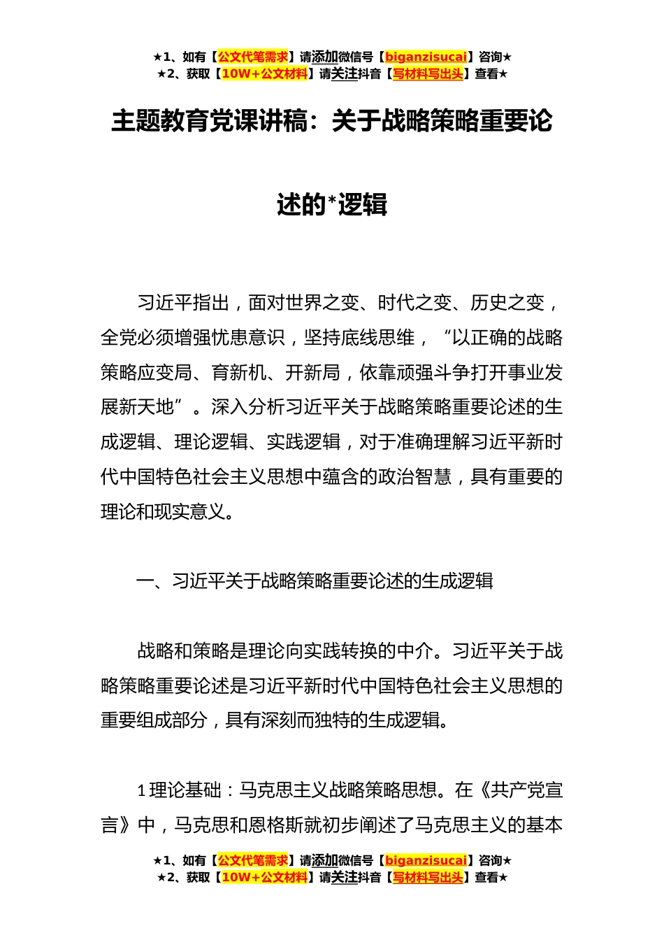 ★1、如有【公文代笔需求】请添加微信号【biganzisucai】咨询★★2、获取【10W+公文材料】请关注抖音【写材料写出头】查看★主题教育党课讲稿:关于战略策略重要论述的*逻辑习近平指出,面对世界之变、时代之变、历史之变,全党必须增强忧患意识,坚持底线思维,“以正确的战略策略应变局、育新机、开新局,依靠顽强斗争打开事业发展新天地”。深入分析习近平关于战略策略重要论述的生成逻辑、理论逻辑、实践逻辑,对于准确理解习近平新时代中国特色社会主义思想中蕴含的政治智慧,具有重要的理论和现实意义。一、习近平关于战略策略重要论述的生成逻辑战略和策略是理论向实践转换的中介。习近平关于战略策略重要论述是习近平新时代中国特色社会主义思想的重要组成部分,具有深刻而独特的生成逻辑。1理论基础:马...