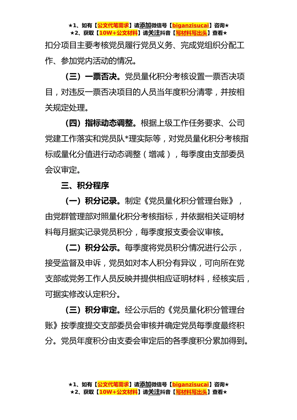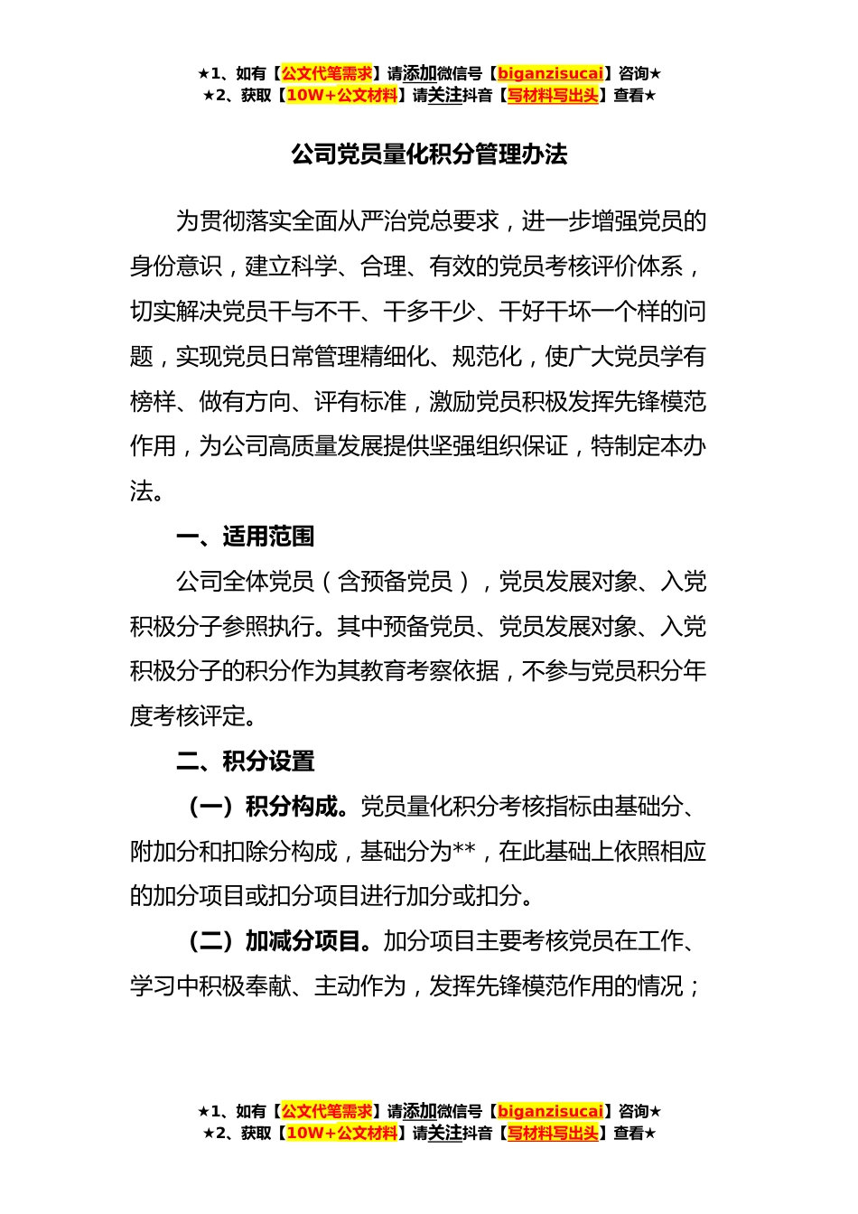★1、如有【公文代笔需求】请添加微信号【biganzisucai】咨询★★2、获取【10W+公文材料】请关注抖音【写材料写出头】查看★公司党员量化积分管理办法为贯彻落实全面从严治党总要求,进一步增强党员的身份意识,建立科学、合理、有效的党员考核评价体系,切实解决党员干与不干、干多干少、干好干坏一个样的问题,实现党员日常管理精细化、规范化,使广大党员学有榜样、做有方向、评有标准,激励党员积极发挥先锋模范作用,为公司高质量发展提供坚强组织保证,特制定本办法。一、适用范围公司全体党员(含预备党员),党员发展对象、入党积极分子参照执行。其中预备党员、党员发展对象、入党积极分子的积分作为其教育考察依据,不参与党员积分年度考核评定。二、积分设置(一)积分构成。党员量化积分考核指标由基...