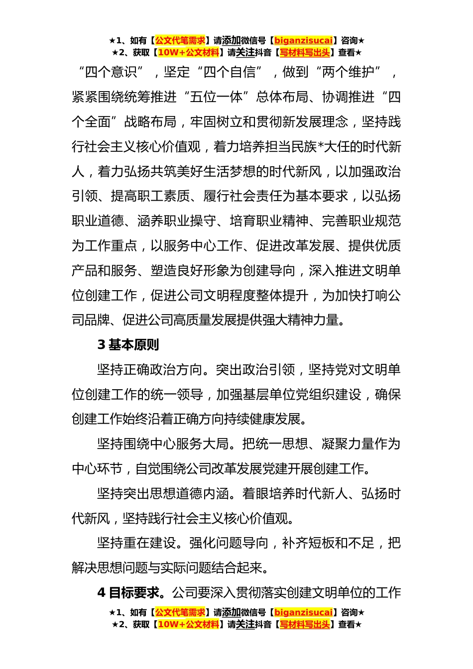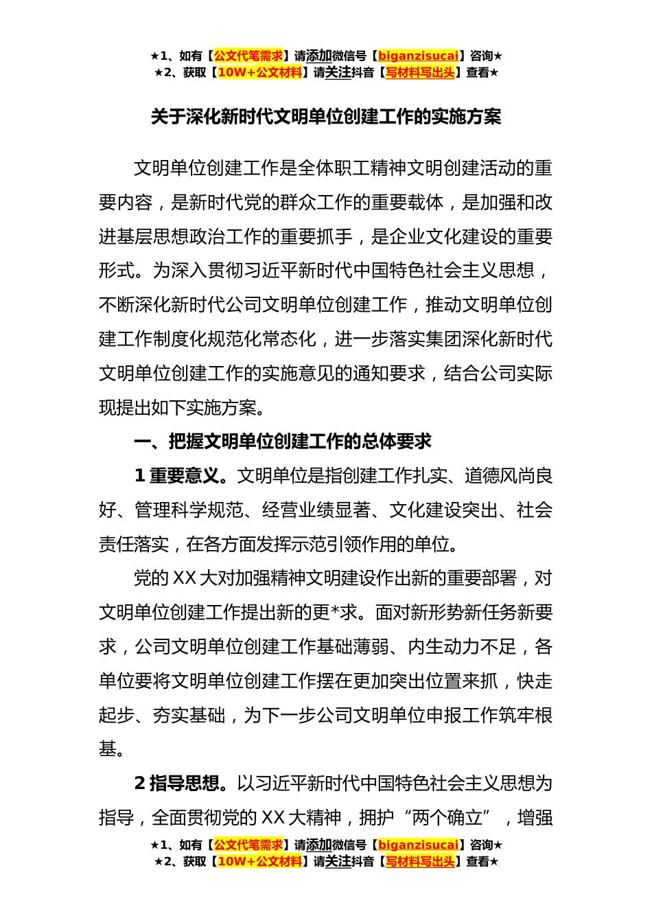 ★1、如有【公文代笔需求】请添加微信号【biganzisucai】咨询★★2、获取【10W+公文材料】请关注抖音【写材料写出头】查看★关于深化新时代文明单位创建工作的实施方案文明单位创建工作是全体职工精神文明创建活动的重要内容,是新时代党的群众工作的重要载体,是加强和改进基层思想政治工作的重要抓手,是企业文化建设的重要形式。为深入贯彻习近平新时代中国特色社会主义思想,不断深化新时代公司文明单位创建工作,推动文明单位创建工作制度化规范化常态化,进一步落实集团深化新时代文明单位创建工作的实施意见的通知要求,结合公司实际现提出如下实施方案。一、把握文明单位创建工作的总体要求1重要意义。文明单位是指创建工作扎实、道德风尚良好、管理科学规范、经营业绩显著、文化建设突出、社会责任落实,...