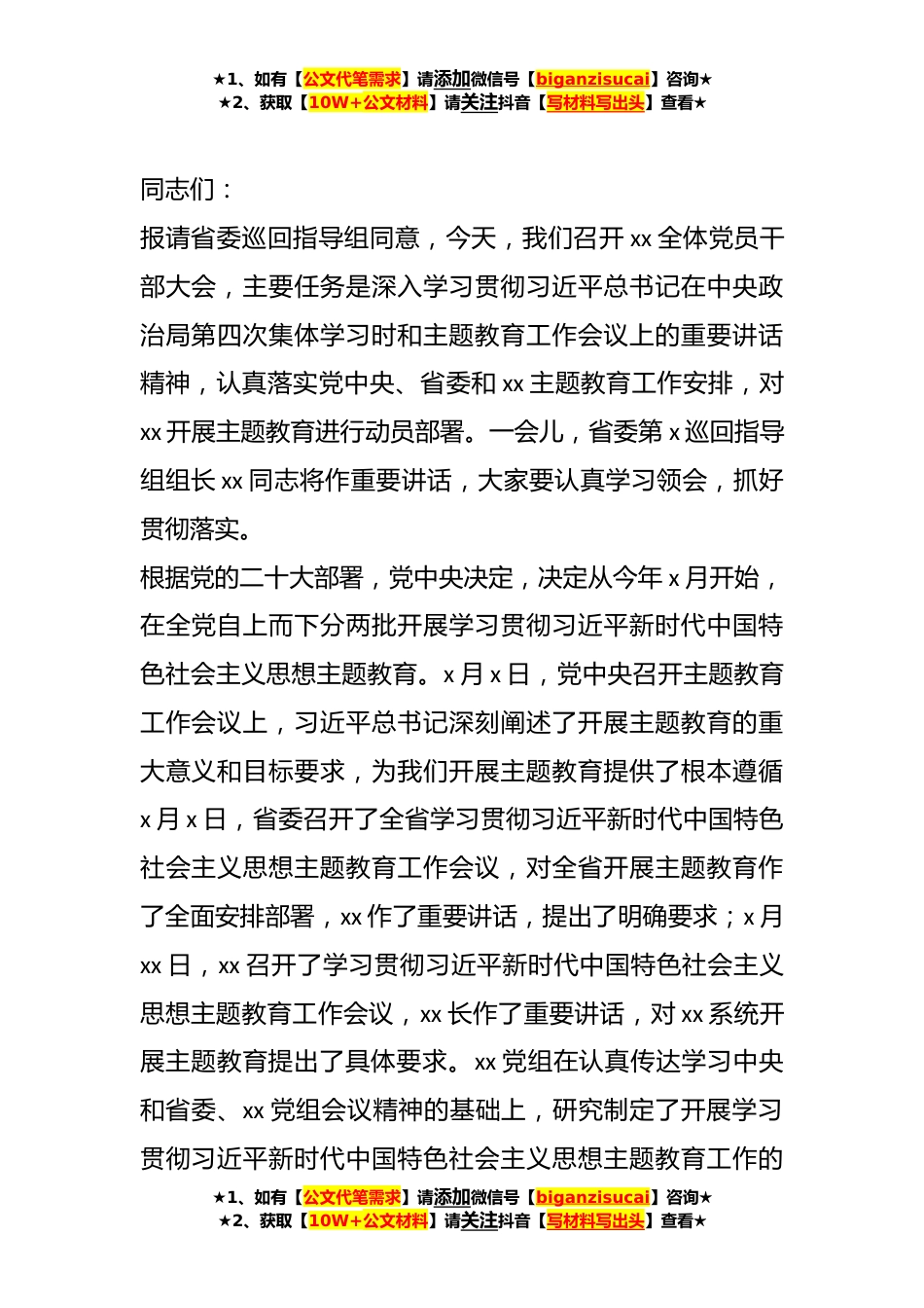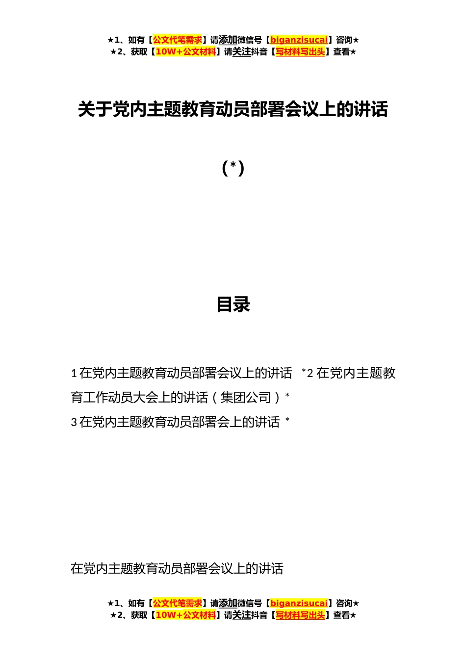 ★1、如有【公文代笔需求】请添加微信号【biganzisucai】咨询★★2、获取【10W+公文材料】请关注抖音【写材料写出头】查看★关于党内主题教育动员部署会议上的讲话(*)目录1在党内主题教育动员部署会议上的讲话*2在党内主题教育工作动员大会上的讲话(集团公司)*3在党内主题教育动员部署会上的讲话*在党内主题教育动员部署会议上的讲话★1、如有【公文代笔需求】请添加微信号【biganzisucai】咨询★★2、获取【10W+公文材料】请关注抖音【写材料写出头】查看★★1、如有【公文代笔需求】请添加微信号【biganzisucai】咨询★★2、获取【10W+公文材料】请关注抖音【写材料写出头】查看★同志们:报请省委巡回指导组同意,今天,我们召开xx全体党员干部大会,主要任务是深入学习贯彻习近平总书记在中央政治局第四次...