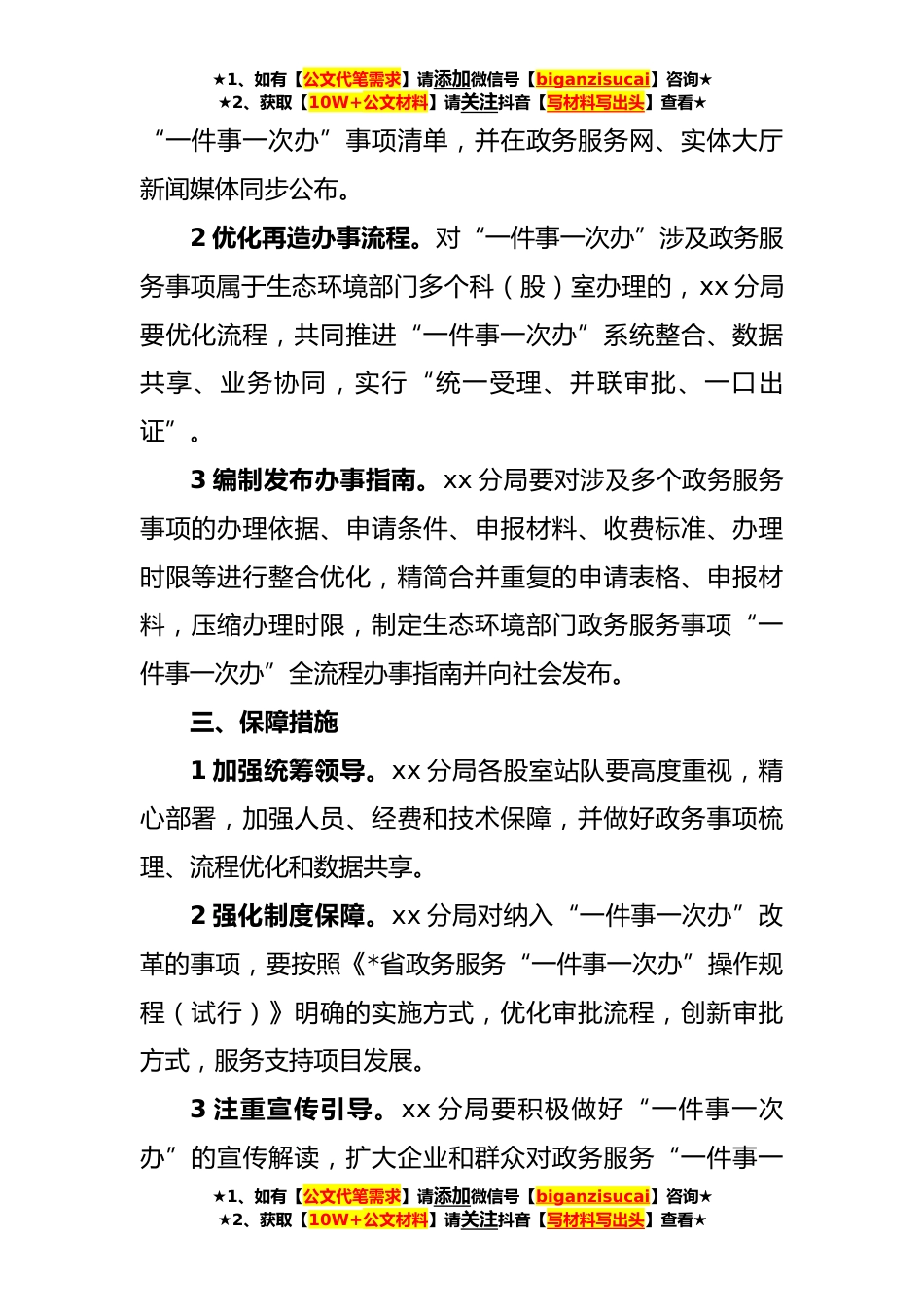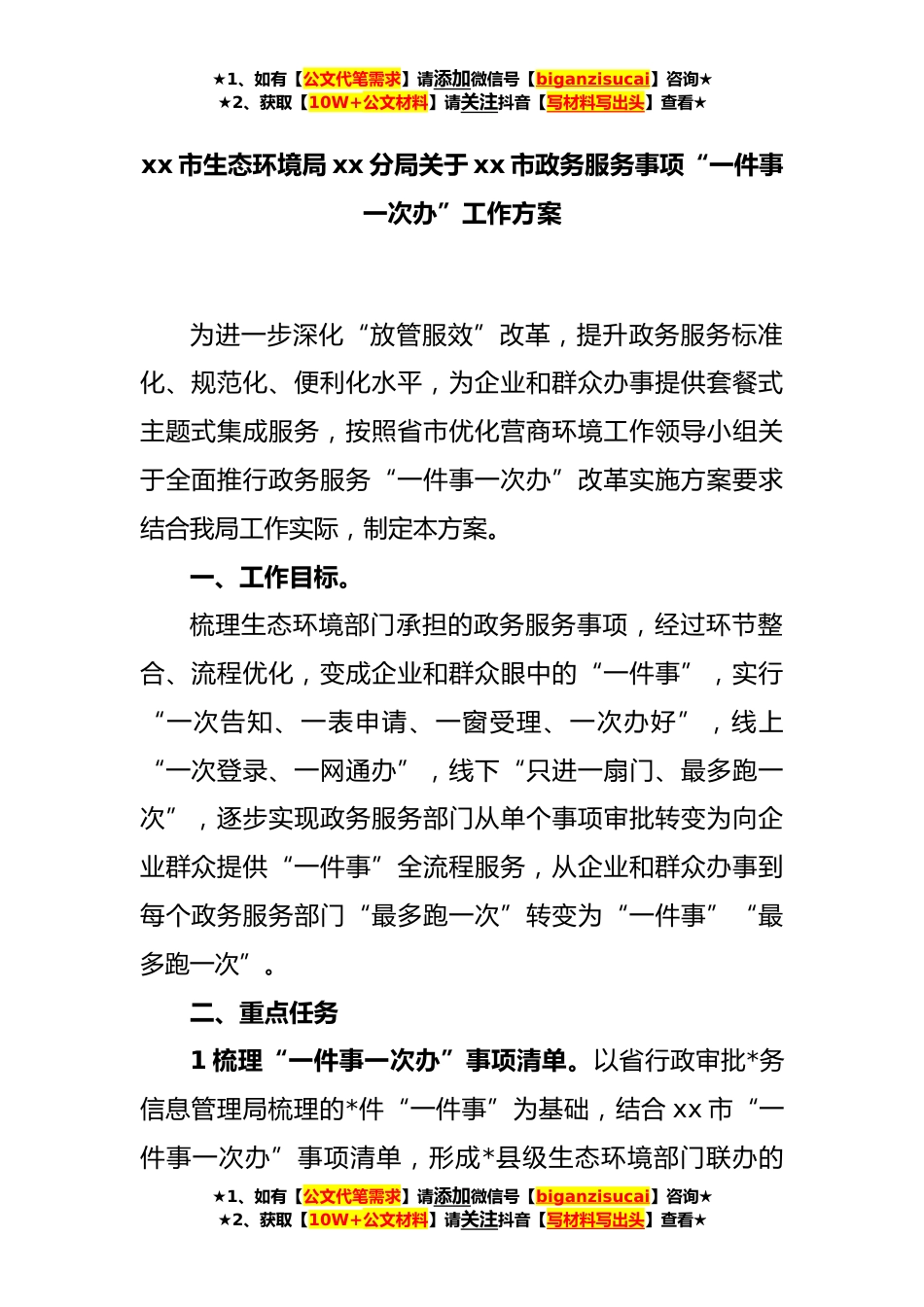 ★1、如有【公文代笔需求】请添加微信号【biganzisucai】咨询★★2、获取【10W+公文材料】请关注抖音【写材料写出头】查看★xx市生态环境局xx分局关于xx市政务服务事项“一件事一次办”工作方案为进一步深化“放管服效”改革,提升政务服务标准化、规范化、便利化水平,为企业和群众办事提供套餐式主题式集成服务,按照省市优化营商环境工作领导小组关于全面推行政务服务“一件事一次办”改革实施方案要求结合我局工作实际,制定本方案。一、工作目标。梳理生态环境部门承担的政务服务事项,经过环节整合、流程优化,变成企业和群众眼中的“一件事”,实行“一次告知、一表申请、一窗受理、一次办好”,线上“一次登录、一网通办”,线下“只进一扇门、最多跑一次”,逐步实现政务服务部门从单个事项审批转变为向...