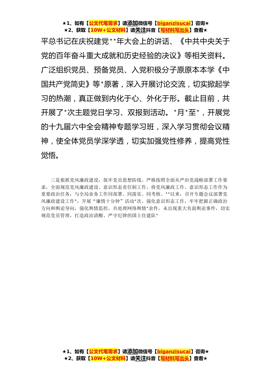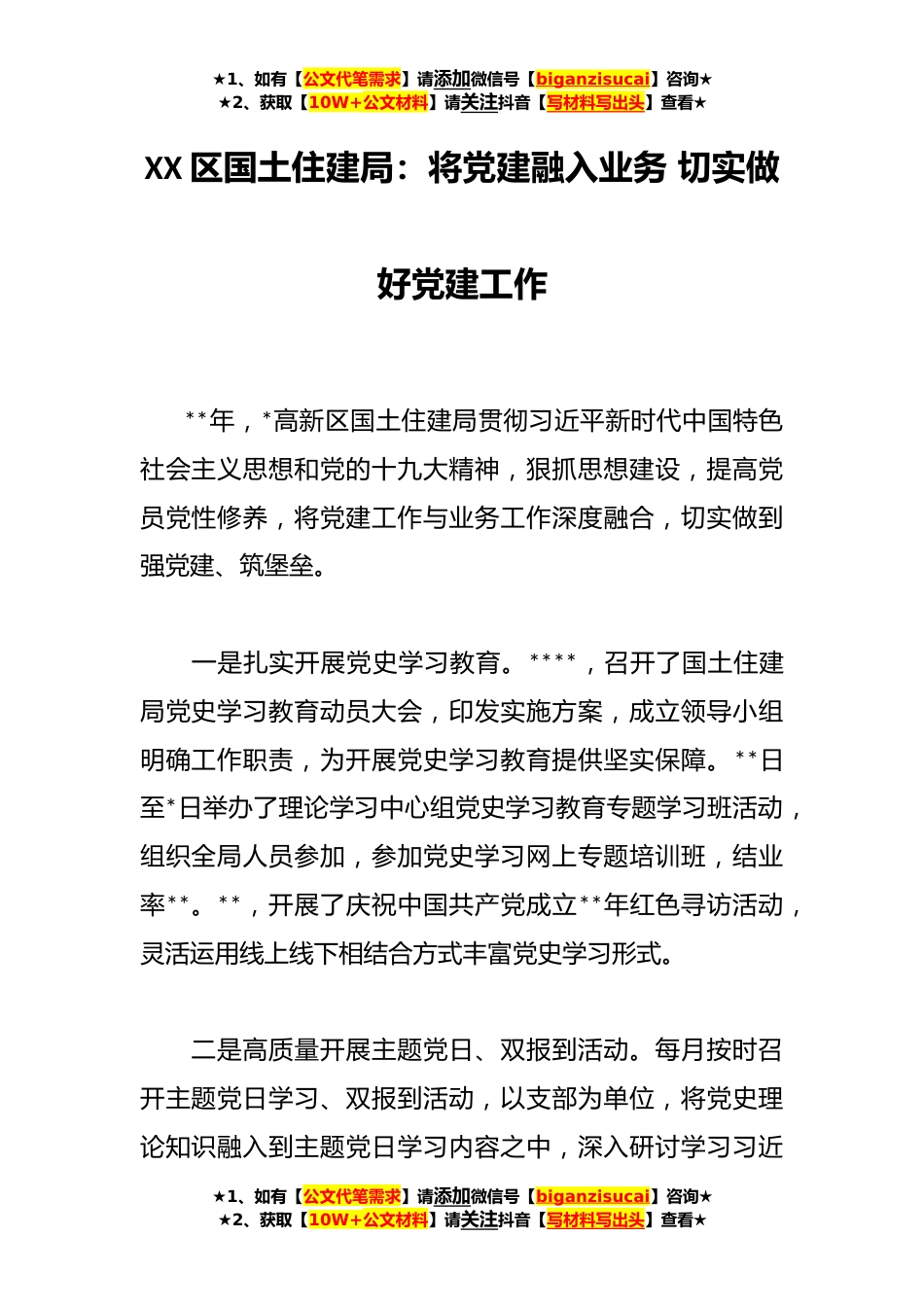 ★1、如有【公文代笔需求】请添加微信号【biganzisucai】咨询★★2、获取【10W+公文材料】请关注抖音【写材料写出头】查看★XX区国土住建局:将党建融入业务切实做好党建工作**年,*高新区国土住建局贯彻习近平新时代中国特色社会主义思想和党的十九大精神,狠抓思想建设,提高党员党性修养,将党建工作与业务工作深度融合,切实做到强党建、筑堡垒。一是扎实开展党史学习教育。****,召开了国土住建局党史学习教育动员大会,印发实施方案,成立领导小组明确工作职责,为开展党史学习教育提供坚实保障。**日至*日举办了理论学习中心组党史学习教育专题学习班活动,组织全局人员参加,参加党史学习网上专题培训班,结业率**。**,开展了庆祝中国共产党成立**年红色寻访活动,灵活运用线上线下相结合方式丰富党史学...