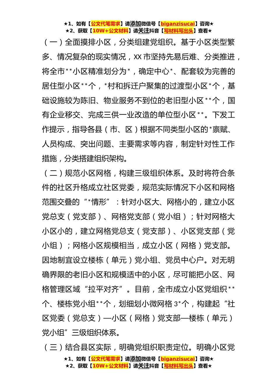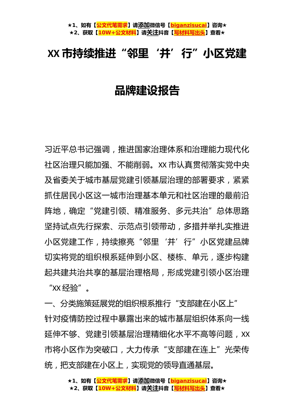 ★1、如有【公文代笔需求】请添加微信号【biganzisucai】咨询★★2、获取【10W+公文材料】请关注抖音【写材料写出头】查看★XX市持续推进“邻里‘并’行”小区党建品牌建设报告习近平总书记强调,推进国家治理体系和治理能力现代化社区治理只能加强、不能削弱。XX市认真贯彻落实党中央及省委关于城市基层党建引领基层治理的部署要求,紧紧抓住居民小区这一城市治理基本单元和社区治理的最前沿阵地,确定“党建引领、精准服务、多元共治”总体思路坚持试点先行探索、示范点引领带动,多措并举扎实推进小区党建工作,持续擦亮“邻里‘并’行”小区党建品牌切实将党的组织根系延伸到小区、楼栋、单元,逐步构建起共建共治共享的基层治理格局,形成党建引领小区治理“XX经验”。一、分类施策延展党的组织根系推行“支...
