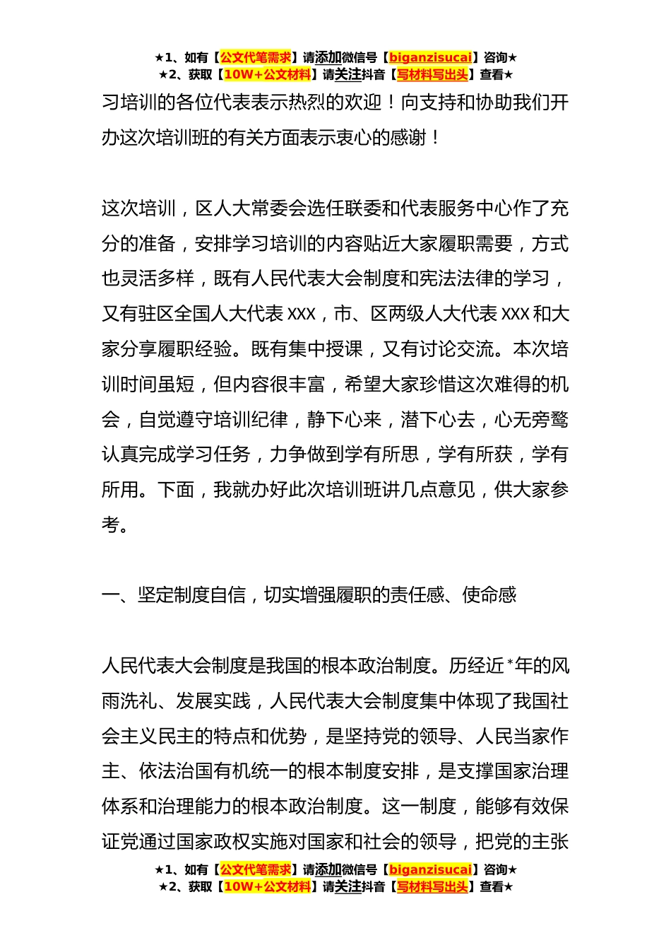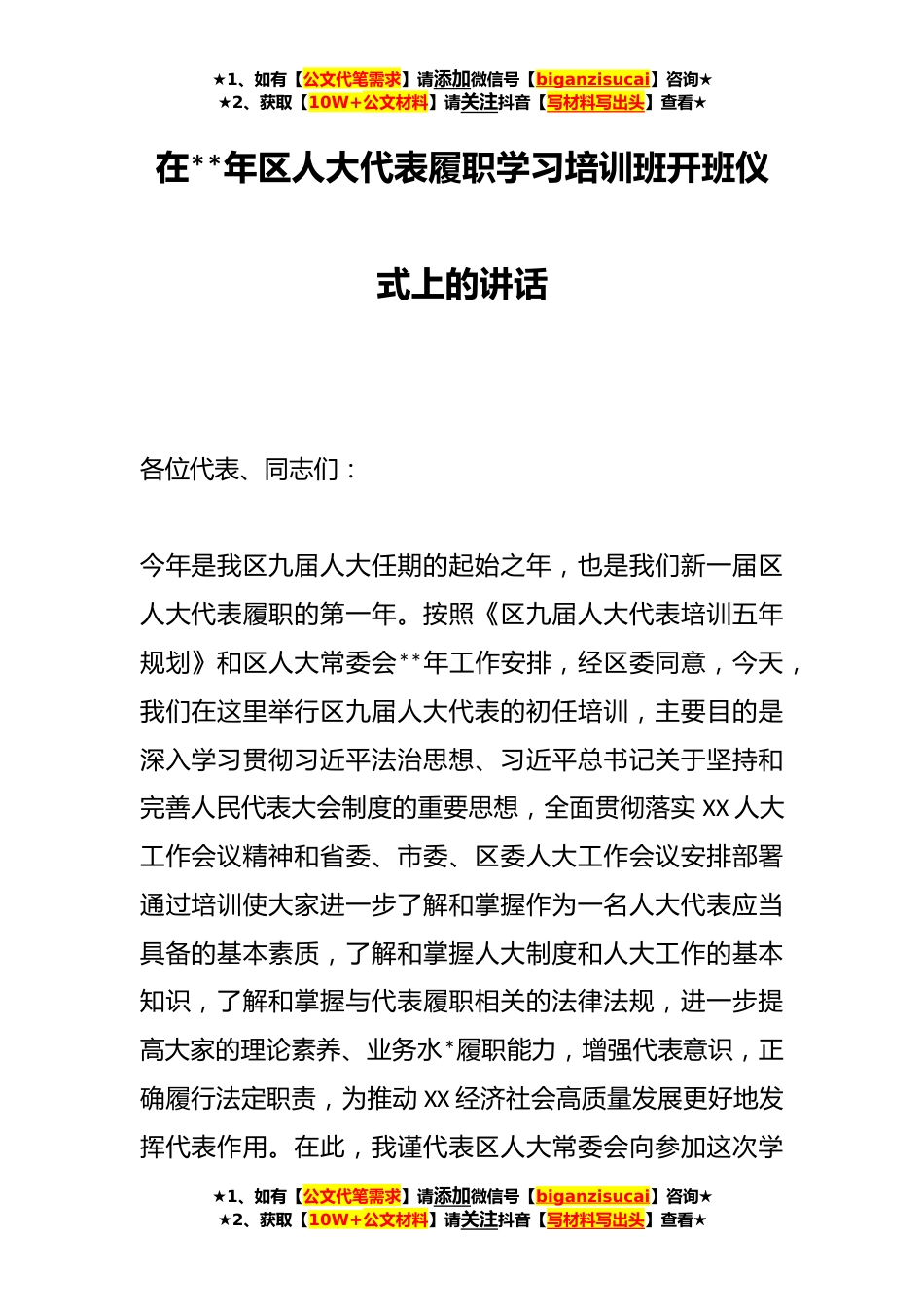 ★1、如有【公文代笔需求】请添加微信号【biganzisucai】咨询★★2、获取【10W+公文材料】请关注抖音【写材料写出头】查看★在**年区人大代表履职学习培训班开班仪式上的讲话各位代表、同志们:今年是我区九届人大任期的起始之年,也是我们新一届区人大代表履职的第一年。按照《区九届人大代表培训五年规划》和区人大常委会**年工作安排,经区委同意,今天,我们在这里举行区九届人大代表的初任培训,主要目的是深入学习贯彻习近平法治思想、习近平总书记关于坚持和完善人民代表大会制度的重要思想,全面贯彻落实XX人大工作会议精神和省委、市委、区委人大工作会议安排部署通过培训使大家进一步了解和掌握作为一名人大代表应当具备的基本素质,了解和掌握人大制度和人大工作的基本知识,了解和掌握与代表履职相关...
