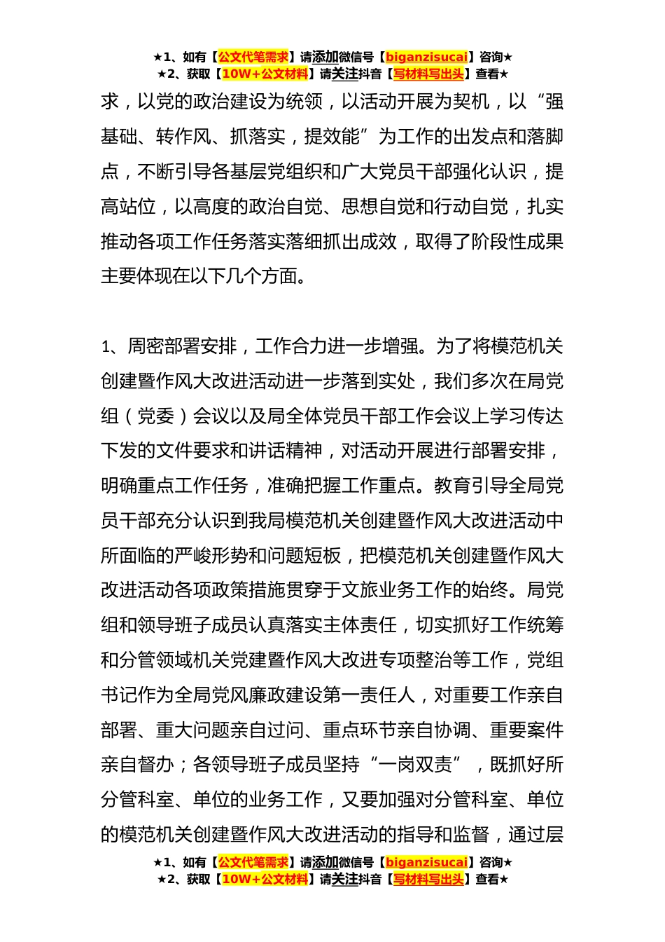 ★1、如有【公文代笔需求】请添加微信号【biganzisucai】咨询★★2、获取【10W+公文材料】请关注抖音【写材料写出头】查看★XX市文化和旅游局局长在模范机关创建暨作风大改进推进会议上的讲话创建让党中央放心、让人民群众满意的模范机关,是当前和今后一个时期机关党建的重要任务,是各级基层党组织必须认真研究解决的重要课题,需要深入研究、积极探索大力推进。而作风大改进则是建设模范机关的应有之义,创建模范机关必须持之以恒正风肃纪,以优良党风、政风带动民风和社会风气的根本好转。今天我们组织召开这次会议,主要是对前一段时间我局在模范机关创建暨作风大改进活动中所做的工作及存在的问题进行总结,对今后的工作开展进行部署安排。一、工作开展情况模范机关创建暨作风大改进活动开展以来,我局坚持...