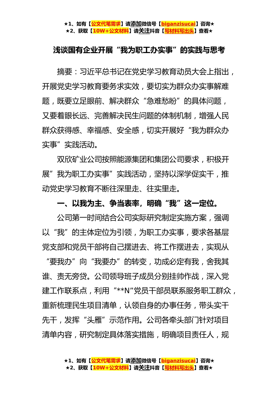 ★1、如有【公文代笔需求】请添加微信号【biganzisucai】咨询★★2、获取【10W+公文材料】请关注抖音【写材料写出头】查看★浅谈国有企业开展“我为职工办实事”的实践与思考摘要:习近平总书记在党史学习教育动员大会上指出,开展党史学习教育要务求实效,要切实为群众办实事解难题,既要立足眼前、解决群众“急难愁盼”的具体问题,又要着眼长远、完善解决民生问题的体制机制,增强人民群众获得感、幸福感、安全感,切实开展好“我为群众办实事”实践活动。双欣矿业公司按照能源集团和集团公司要求,积极开展”我为职工办实事”实践活动,坚持以深学促实干,推动党史学习教育不断往深里走、往实里走。一、以我为主、争当表率,明确“我”这一定位。公司第一时间结合公司实际研究制定实施方案,强调以“我”的主...