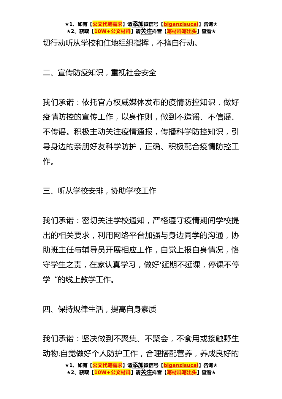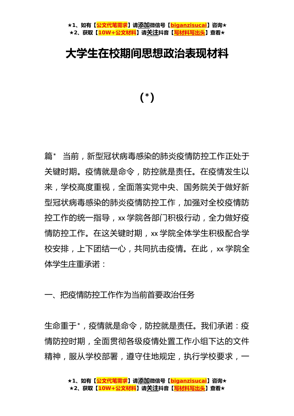 ★1、如有【公文代笔需求】请添加微信号【biganzisucai】咨询★★2、获取【10W+公文材料】请关注抖音【写材料写出头】查看★大学生在校期间思想政治表现材料(*)篇*当前,新型冠状病毒感染的肺炎疫情防控工作正处于关键时期。疫情就是命令,防控就是责任。在疫情发生以来,学校高度重视,全面落实党中央、国务院关于做好新型冠状病毒感染的肺炎疫情防控工作,加强对全校疫情防控工作的统一指导,xx学院各部门积极行动,全力做好疫情防控工作。在这关键时期,xx学院全体学生积极配合学校安排,上下团结一心,共同抗击疫情。在此,xx学院全体学生庄重承诺:一、把疫情防控工作作为当前首要政治任务生命重于*,疫情就是命令,防控就是责任。我们承诺:疫情防控时期,全面贯彻各级疫情处置工作小组下达的文件精神,服...