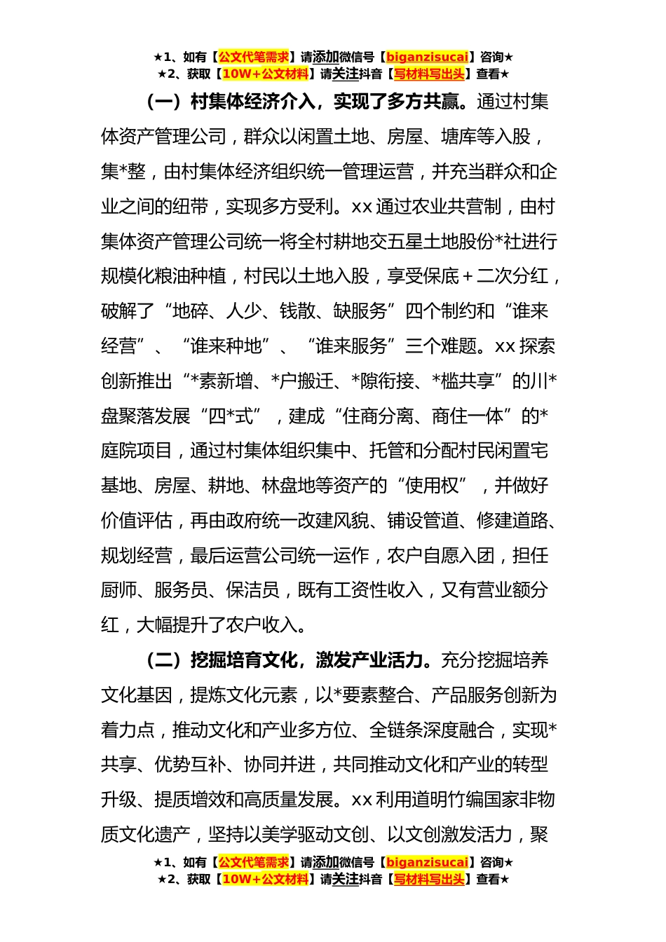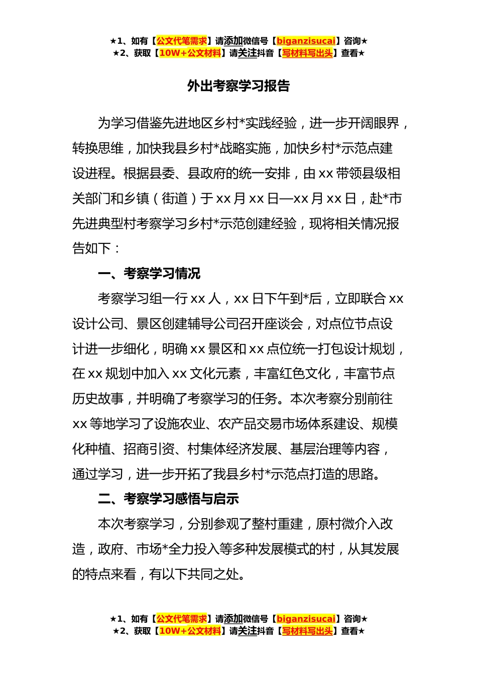 ★1、如有【公文代笔需求】请添加微信号【biganzisucai】咨询★★2、获取【10W+公文材料】请关注抖音【写材料写出头】查看★外出考察学习报告为学习借鉴先进地区乡村*实践经验,进一步开阔眼界,转换思维,加快我县乡村*战略实施,加快乡村*示范点建设进程。根据县委、县政府的统一安排,由xx带领县级相关部门和乡镇(街道)于xx月xx日—xx月xx日,赴*市先进典型村考察学习乡村*示范创建经验,现将相关情况报告如下:一、考察学习情况考察学习组一行xx人,xx日下午到*后,立即联合xx设计公司、景区创建辅导公司召开座谈会,对点位节点设计进一步细化,明确xx景区和xx点位统一打包设计规划,在xx规划中加入xx文化元素,丰富红色文化,丰富节点历史故事,并明确了考察学习的任务。本次考察分别前往xx等地学习了设施...