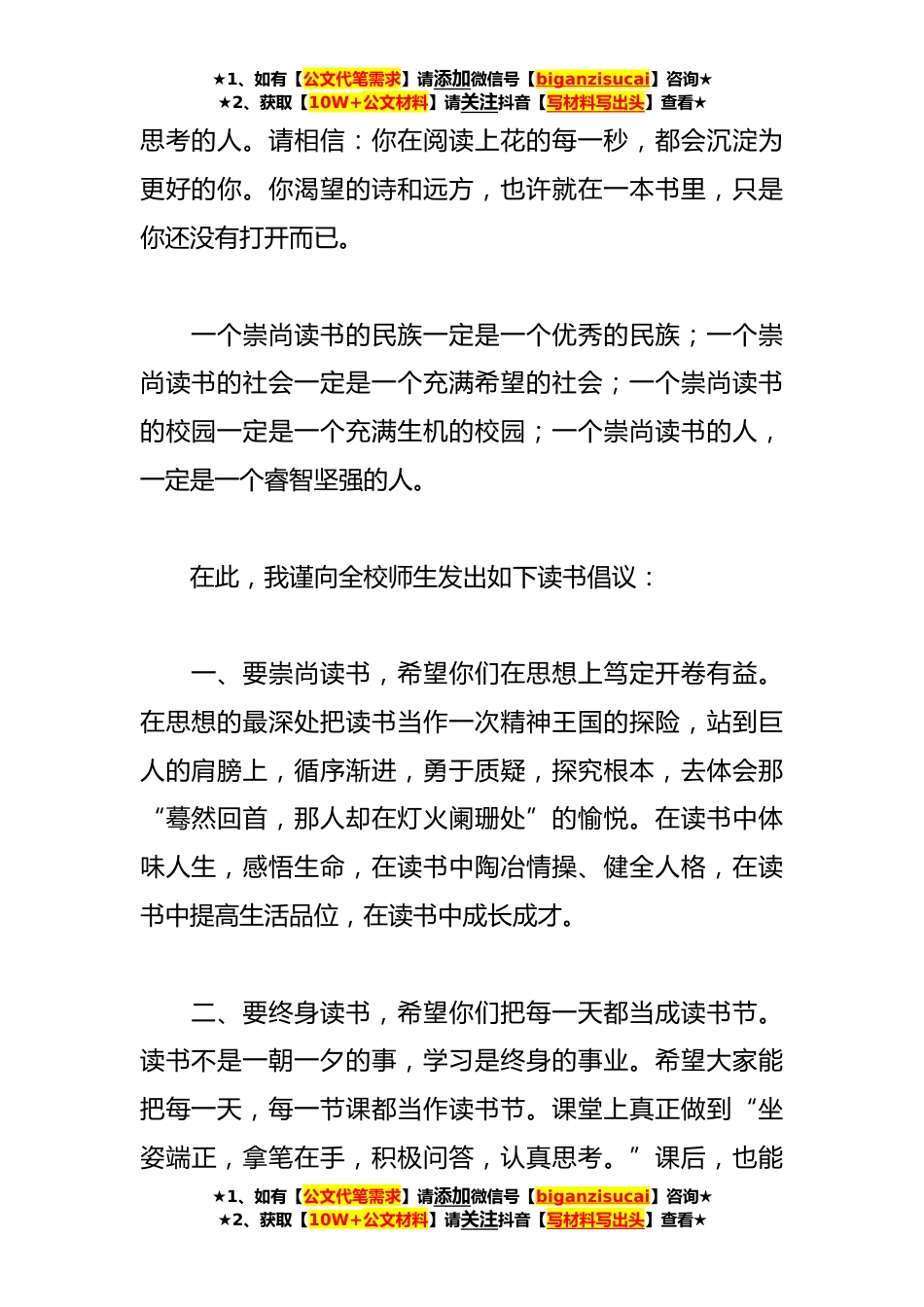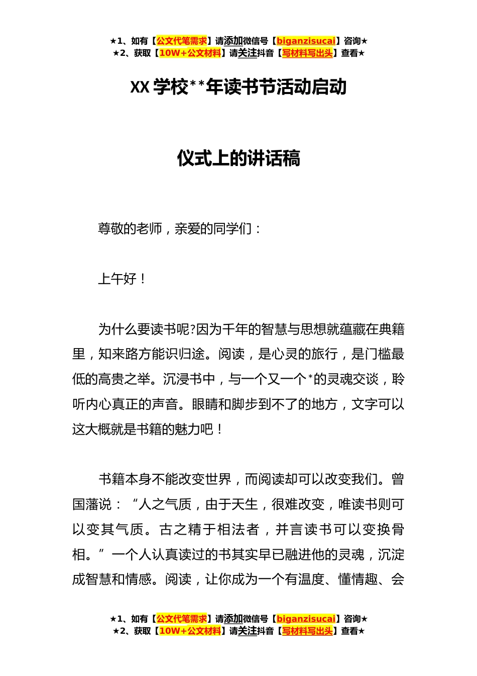 ★1、如有【公文代笔需求】请添加微信号【biganzisucai】咨询★★2、获取【10W+公文材料】请关注抖音【写材料写出头】查看★XX学校**年读书节活动启动仪式上的讲话稿尊敬的老师,亲爱的同学们:上午好!为什么要读书呢?因为千年的智慧与思想就蕴藏在典籍里,知来路方能识归途。阅读,是心灵的旅行,是门槛最低的高贵之举。沉浸书中,与一个又一个*的灵魂交谈,聆听内心真正的声音。眼睛和脚步到不了的地方,文字可以这大概就是书籍的魅力吧!书籍本身不能改变世界,而阅读却可以改变我们。曾国藩说:“人之气质,由于天生,很难改变,唯读书则可以变其气质。古之精于相法者,并言读书可以变换骨相。”一个人认真读过的书其实早已融进他的灵魂,沉淀成智慧和情感。阅读,让你成为一个有温度、懂情趣、会★1、如有【...