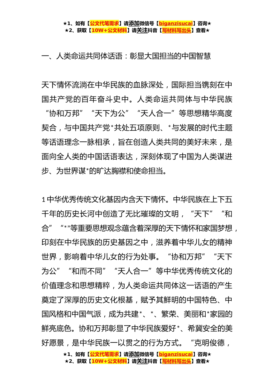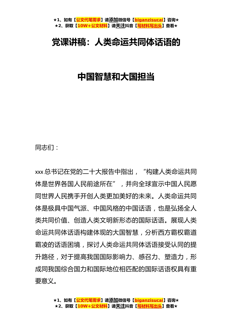 ★1、如有【公文代笔需求】请添加微信号【biganzisucai】咨询★★2、获取【10W+公文材料】请关注抖音【写材料写出头】查看★党课讲稿:人类命运共同体话语的中国智慧和大国担当同志们:xxx总书记在党的二十大报告中指出,“构建人类命运共同体是世界各国人民前途所在”,并向全球宣示中国人民愿同世界人民携手开创人类更加美好的未来。人类命运共同体是极具中国气派、中国风格的中国话语,也是弘扬全人类共同价值、创造人类文明新形态的国际话语。展现人类命运共同体话语构建体现的大国智慧,分析西方霸权霸道霸凌的话语困境,探讨人类命运共同体话语接受认同的提升路径,对于提高我国国际影响力、感召力、塑造力,形成同我国综合国力和国际地位相匹配的国际话语权具有重要意义。★1、如有【公文代笔需求】请添加...