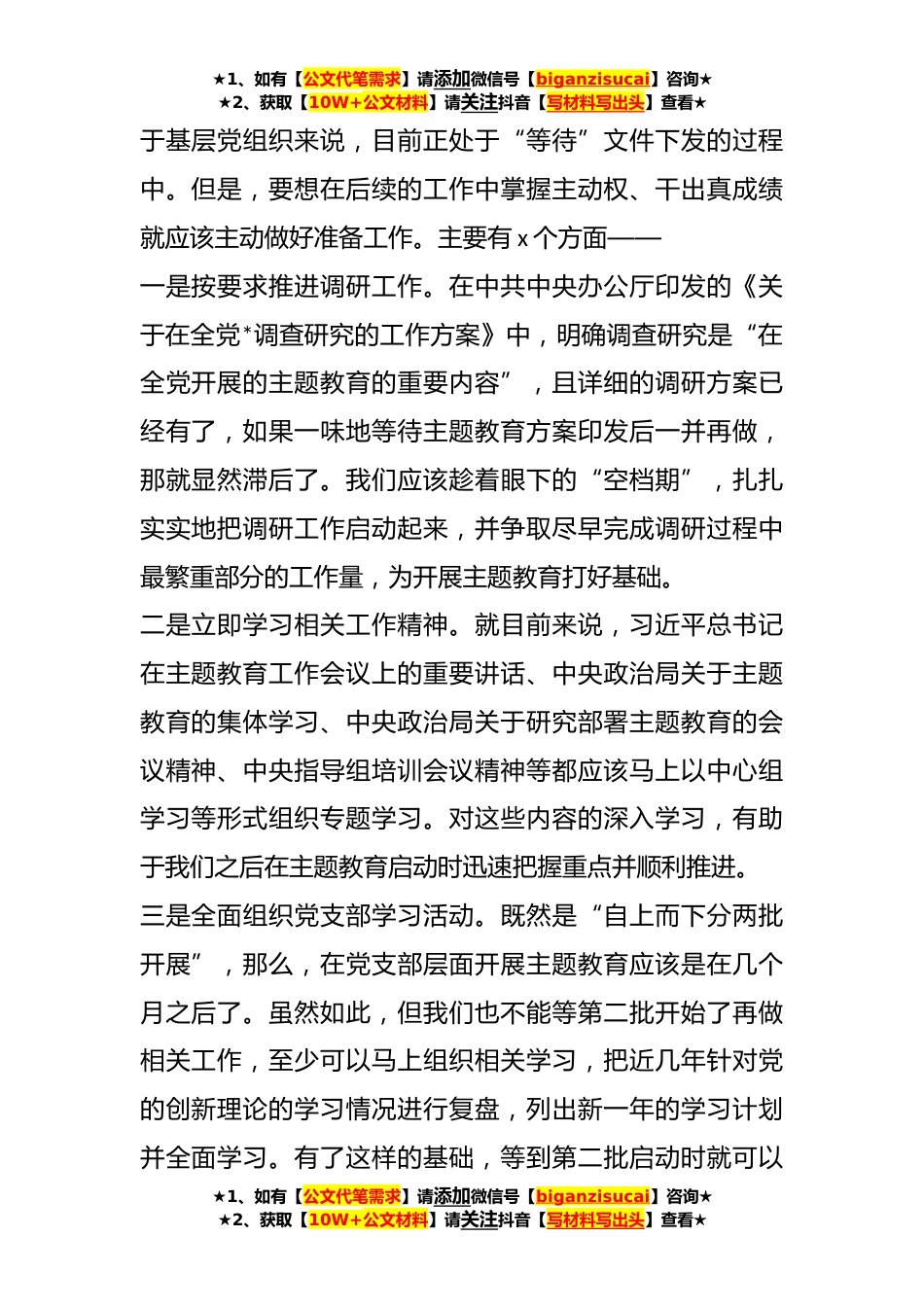 ★1、如有【公文代笔需求】请添加微信号【biganzisucai】咨询★★2、获取【10W+公文材料】请关注抖音【写材料写出头】查看★党内主题教育开展准备要点梳理材料汇编(*)目录1基层党组织应该做好的*准备工作*2主题教育启动会*召开,x个动作要跟上*3主题教育几个必会知识点*基层党组织应该做好的*准备工作最近,关于主题教育的新闻报道比较密集,公开了很多关于主题教育的较为明确的信息。既然主题教育“从今年x月开始,在全党自上而下分两批开展”,那么,很显然,对★1、如有【公文代笔需求】请添加微信号【biganzisucai】咨询★★2、获取【10W+公文材料】请关注抖音【写材料写出头】查看★★1、如有【公文代笔需求】请添加微信号【biganzisucai】咨询★★2、获取【10W+公文材料】请关注抖音【写材料写出头】查看...