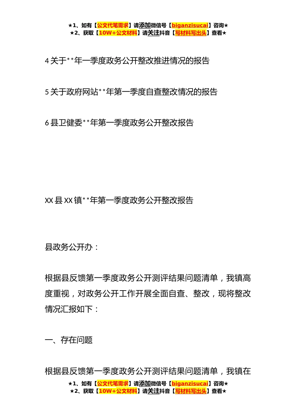 ★1、如有【公文代笔需求】请添加微信号【biganzisucai】咨询★★2、获取【10W+公文材料】请关注抖音【写材料写出头】查看★**年第一季度整改报告汇编(*)目录1XX县XX镇**年第一季度政务公开整改报告2关于**年第一季度政务公开测评问题整改情况的报告3关于**年第一季度政务公开自查整改情况的报告★1、如有【公文代笔需求】请添加微信号【biganzisucai】咨询★★2、获取【10W+公文材料】请关注抖音【写材料写出头】查看★★1、如有【公文代笔需求】请添加微信号【biganzisucai】咨询★★2、获取【10W+公文材料】请关注抖音【写材料写出头】查看★4关于**年一季度政务公开整改推进情况的报告5关于政府网站**年第一季度自查整改情况的报告6县卫健委**年第一季度政务公开整改报告XX县XX镇**年第一季度政务公开整改报...