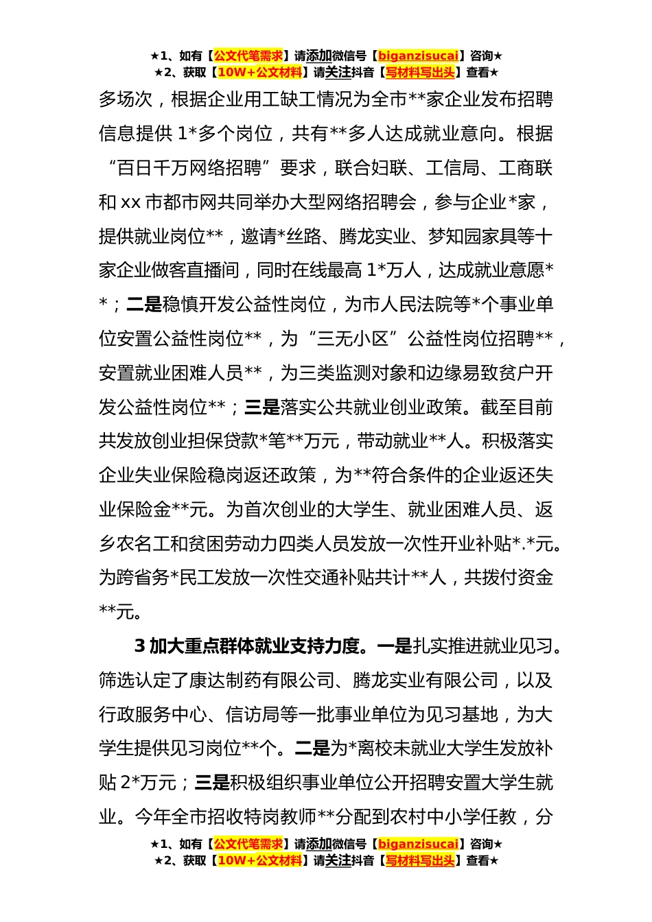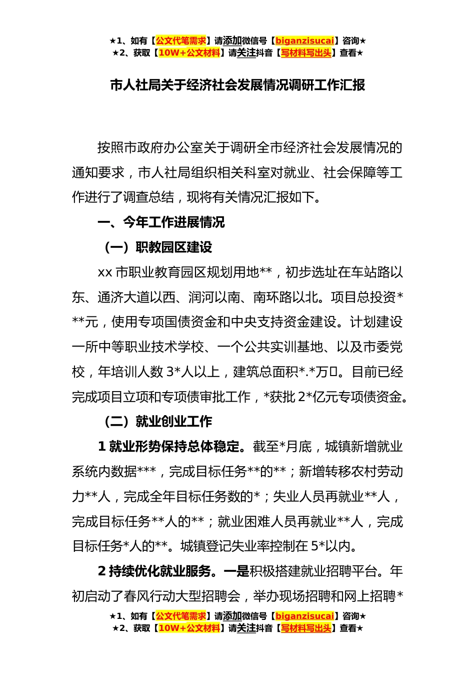 ★1、如有【公文代笔需求】请添加微信号【biganzisucai】咨询★★2、获取【10W+公文材料】请关注抖音【写材料写出头】查看★市人社局关于经济社会发展情况调研工作汇报按照市政府办公室关于调研全市经济社会发展情况的通知要求,市人社局组织相关科室对就业、社会保障等工作进行了调查总结,现将有关情况汇报如下。一、今年工作进展情况(一)职教园区建设xx市职业教育园区规划用地**,初步选址在车站路以东、通济大道以西、润河以南、南环路以北。项目总投资***元,使用专项国债资金和中央支持资金建设。计划建设一所中等职业技术学校、一个公共实训基地、以及市委党校,年培训人数3*人以上,建筑总面积*.*万㎡。目前已经完成项目立项和专项债审批工作,*获批2*亿元专项债资金。(二)就业创业工作1就业形势保持...