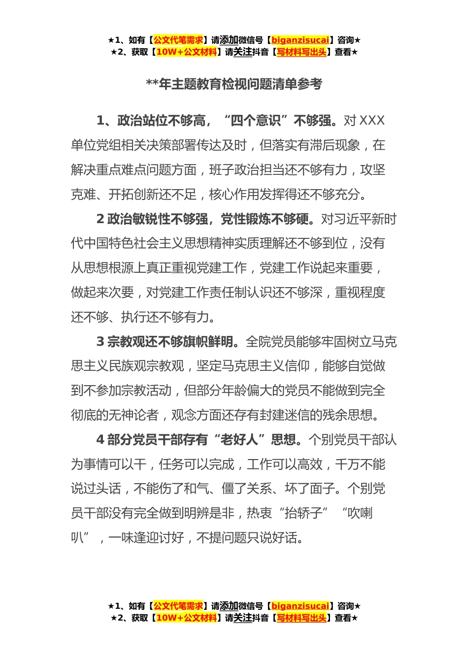 ★1、如有【公文代笔需求】请添加微信号【biganzisucai】咨询★★2、获取【10W+公文材料】请关注抖音【写材料写出头】查看★**年主题教育检视问题清单参考1、政治站位不够高,“四个意识”不够强。对XXX单位党组相关决策部署传达及时,但落实有滞后现象,在解决重点难点问题方面,班子政治担当还不够有力,攻坚克难、开拓创新还不足,核心作用发挥得还不够充分。2政治敏锐性不够强,党性锻炼不够硬。对习近平新时代中国特色社会主义思想精神实质理解还不够到位,没有从思想根源上真正重视党建工作,党建工作说起来重要,做起来次要,对党建工作责任制认识还不够深,重视程度还不够、执行还不够有力。3宗教观还不够旗帜鲜明。全院党员能够牢固树立马克思主义民族观宗教观,坚定马克思主义信仰,能够自觉做到不参加...