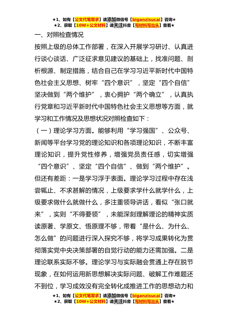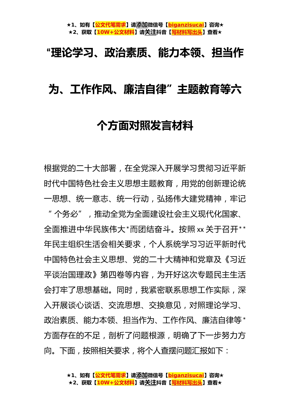 ★1、如有【公文代笔需求】请添加微信号【biganzisucai】咨询★★2、获取【10W+公文材料】请关注抖音【写材料写出头】查看★“理论学习、政治素质、能力本领、担当作为、工作作风、廉洁自律”主题教育等六个方面对照发言材料根据党的二十大部署,在全党深入开展学习贯彻习近平新时代中国特色社会主义思想主题教育,用党的创新理论统一思想、统一意志、统一行动,弘扬伟大建党精神,牢记“个务必”,推动全党为全面建设社会主义现代化国家、全面推进中华民族伟大*而团结奋斗。按照xx关于召开**年民主组织生活会相关要求,个人系统学习习近平新时代中国特色社会主义思想、党的二十大精神和党章及《习近平谈治国理政》第四卷等内容,为开好这次专题民主生活会打牢了思想基础。同时,我紧密联系思想工作实际,深入开展...