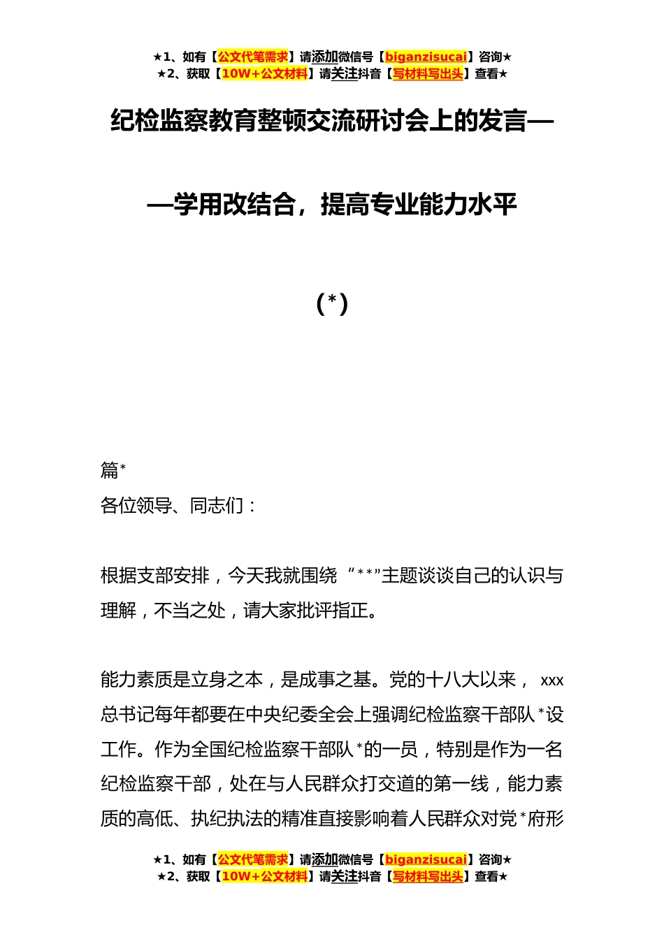 ★1、如有【公文代笔需求】请添加微信号【biganzisucai】咨询★★2、获取【10W+公文材料】请关注抖音【写材料写出头】查看★纪检监察教育整顿交流研讨会上的发言——学用改结合,提高专业能力水平(*)篇*各位领导、同志们:根据支部安排,今天我就围绕“**”主题谈谈自己的认识与理解,不当之处,请大家批评指正。能力素质是立身之本,是成事之基。党的十八大以来,xxx总书记每年都要在中央纪委全会上强调纪检监察干部队*设工作。作为全国纪检监察干部队*的一员,特别是作为一名纪检监察干部,处在与人民群众打交道的第一线,能力素质的高低、执纪执法的精准直接影响着人民群众对党*府形★1、如有【公文代笔需求】请添加微信号【biganzisucai】咨询★★2、获取【10W+公文材料】请关注抖音【写材料写出头】查看★...