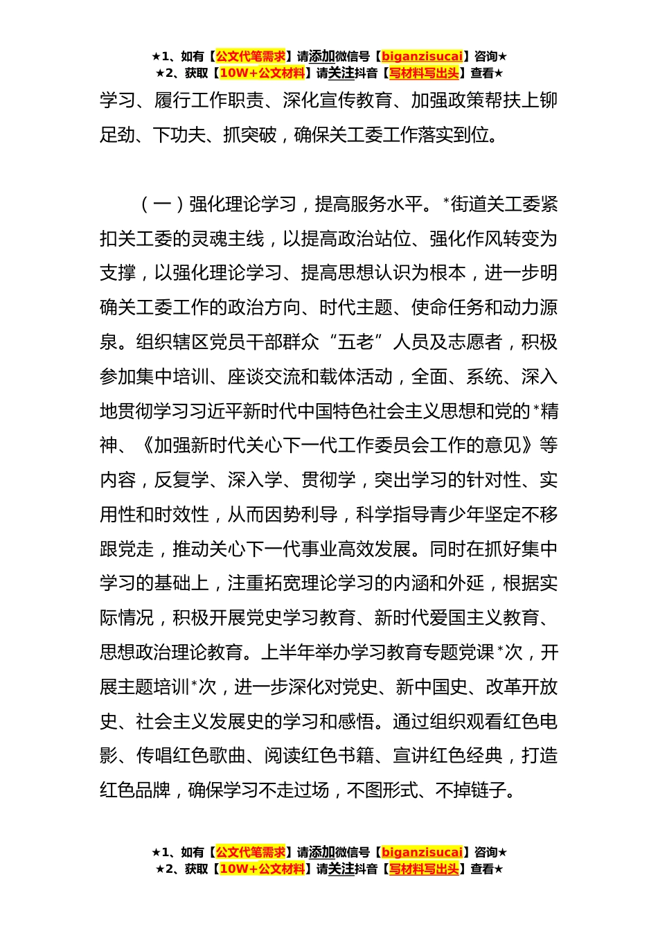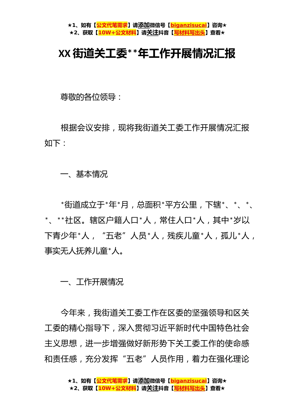 ★1、如有【公文代笔需求】请添加微信号【biganzisucai】咨询★★2、获取【10W+公文材料】请关注抖音【写材料写出头】查看★XX街道关工委**年工作开展情况汇报尊敬的各位领导:根据会议安排,现将我街道关工委工作开展情况汇报如下:一、基本情况*街道成立于*年*月,总面积*平方公里,下辖*、*、*、*、**社区。辖区户籍人口*人,常住人口*人,其中*岁以下青少年*人,“五老”人员*人,残疾儿童*人,孤儿*人,事实无人抚养儿童*人。一、工作开展情况今年来,我街道关工委工作在区委的坚强领导和区关工委的精心指导下,深入贯彻习近平新时代中国特色社会主义思想,进一步增强做好新形势下关工委工作的使命感和责任感,充分发挥“五老”人员作用,着力在强化理论★1、如有【公文代笔需求】请添加微信号【biganzisucai...
