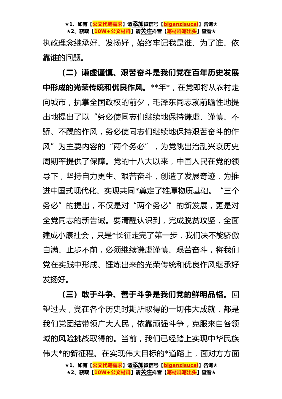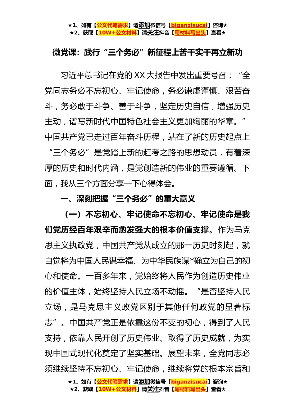 ★1、如有【公文代笔需求】请添加微信号【biganzisucai】咨询★★2、获取【10W+公文材料】请关注抖音【写材料写出头】查看★微党课:践行“三个务必”新征程上苦干实干再立新功习近平总书记在党的XX大报告中发出重要号召:“全党同志务必不忘初心、牢记使命,务必谦虚谨慎、艰苦奋斗,务必敢于斗争、善于斗争,坚定历史自信,增强历史主动,谱写新时代中国特色社会主义更加绚丽的华章。”中国共产党已走过百年奋斗历程,站在了新的历史起点上“三个务必”是党踏上新的赶考之路的思想动员,有着深厚的历史和时代内涵,是党创造新的伟业的重要遵循。下面,我从三个方面分享一下心得体会。一、深刻把握“三个务必”的重大意义(一)不忘初心、牢记使命不忘初心、牢记使命是我们党历经百年艰辛而愈发强大的根本价值支...