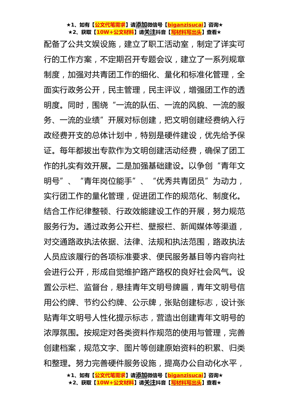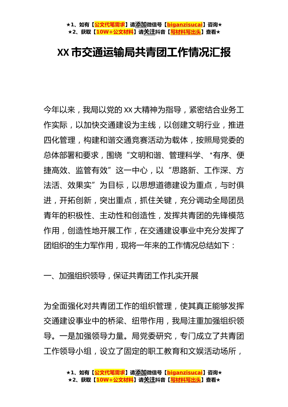 ★1、如有【公文代笔需求】请添加微信号【biganzisucai】咨询★★2、获取【10W+公文材料】请关注抖音【写材料写出头】查看★XX市交通运输局共青团工作情况汇报今年以来,我局以党的XX大精神为指导,紧密结合业务工作实际,以加快交通建设为主线,以创建文明行业,推进四化管理,构建和谐交通竞赛活动为载体,按照局党委的总体部署和要求,围绕“文明和谐、管理科学、*有序、便捷高效、监管有效”这一中心,以“思路新、工作深、方法活、效果实”为目标,以思想道德建设为重点,与时俱进,开拓创新,突出重点,抓住关键,充分调动全局团员青年的积极性、主动性和创造性,发挥共青团的先锋模范作用,创造性地开展工作,在交通建设事业中充分发挥了团组织的生力军作用,现将一年来的工作情况总结如下:一、加强组织领...