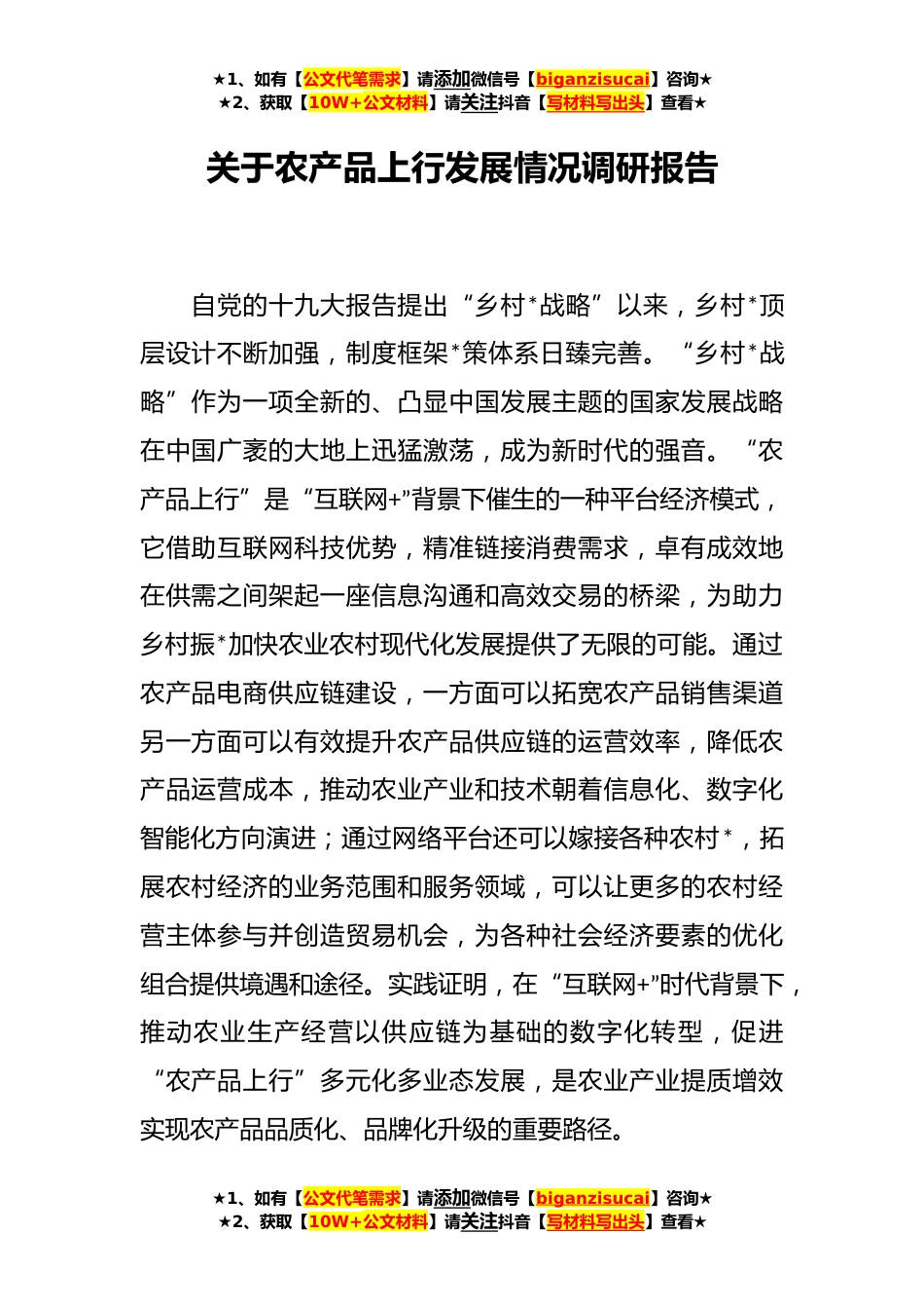 ★1、如有【公文代笔需求】请添加微信号【biganzisucai】咨询★★2、获取【10W+公文材料】请关注抖音【写材料写出头】查看★关于农产品上行发展情况调研报告自党的十九大报告提出“乡村*战略”以来,乡村*顶层设计不断加强,制度框架*策体系日臻完善。“乡村*战略”作为一项全新的、凸显中国发展主题的国家发展战略在中国广袤的大地上迅猛激荡,成为新时代的强音。“农产品上行”是“互联网+”背景下催生的一种平台经济模式,它借助互联网科技优势,精准链接消费需求,卓有成效地在供需之间架起一座信息沟通和高效交易的桥梁,为助力乡村振*加快农业农村现代化发展提供了无限的可能。通过农产品电商供应链建设,一方面可以拓宽农产品销售渠道另一方面可以有效提升农产品供应链的运营效率,降低农产品运营成本,推...