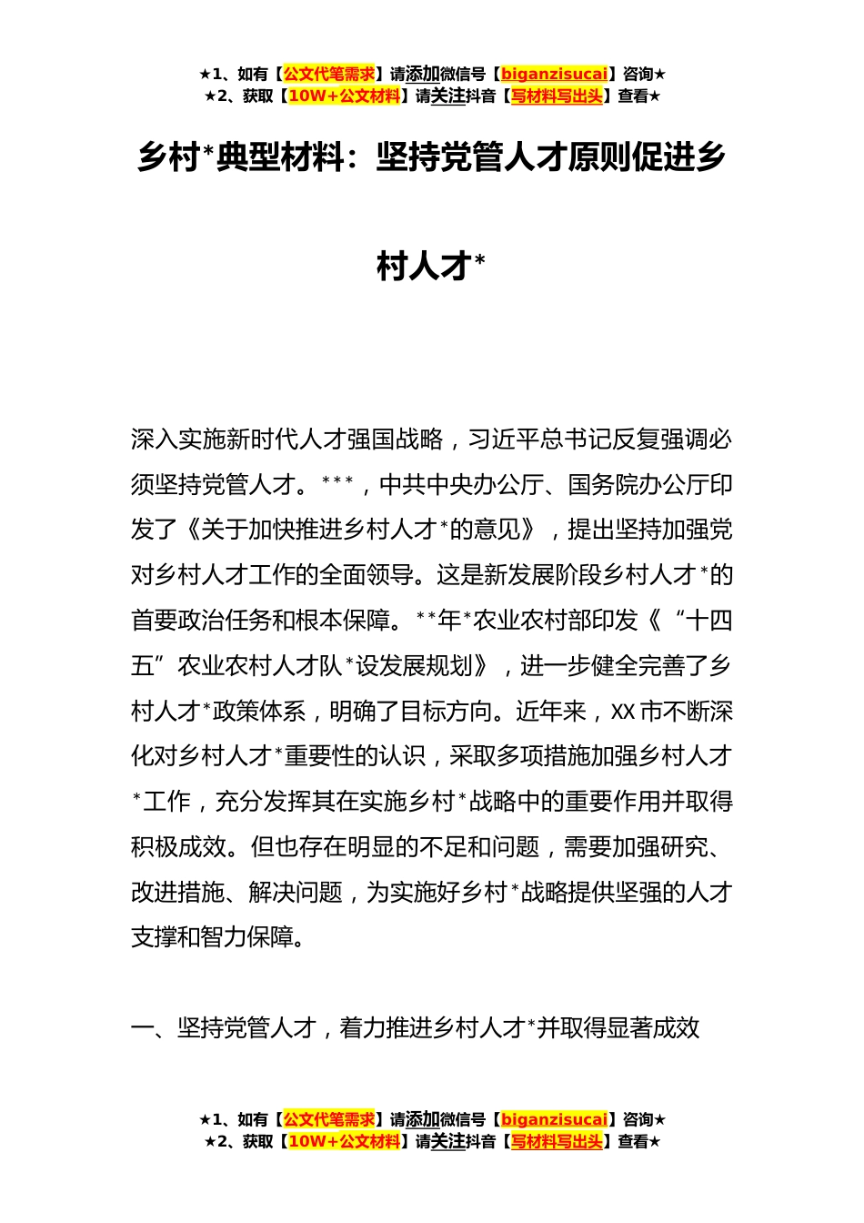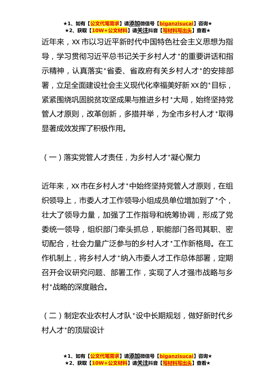 ★1、如有【公文代笔需求】请添加微信号【biganzisucai】咨询★★2、获取【10W+公文材料】请关注抖音【写材料写出头】查看★乡村*典型材料:坚持党管人才原则促进乡村人才*深入实施新时代人才强国战略,习近平总书记反复强调必须坚持党管人才。***,中共中央办公厅、国务院办公厅印发了《关于加快推进乡村人才*的意见》,提出坚持加强党对乡村人才工作的全面领导。这是新发展阶段乡村人才*的首要政治任务和根本保障。**年*农业农村部印发《“十四五”农业农村人才队*设发展规划》,进一步健全完善了乡村人才*政策体系,明确了目标方向。近年来,XX市不断深化对乡村人才*重要性的认识,采取多项措施加强乡村人才*工作,充分发挥其在实施乡村*战略中的重要作用并取得积极成效。但也存在明显的不足和问题,需要加强研...
