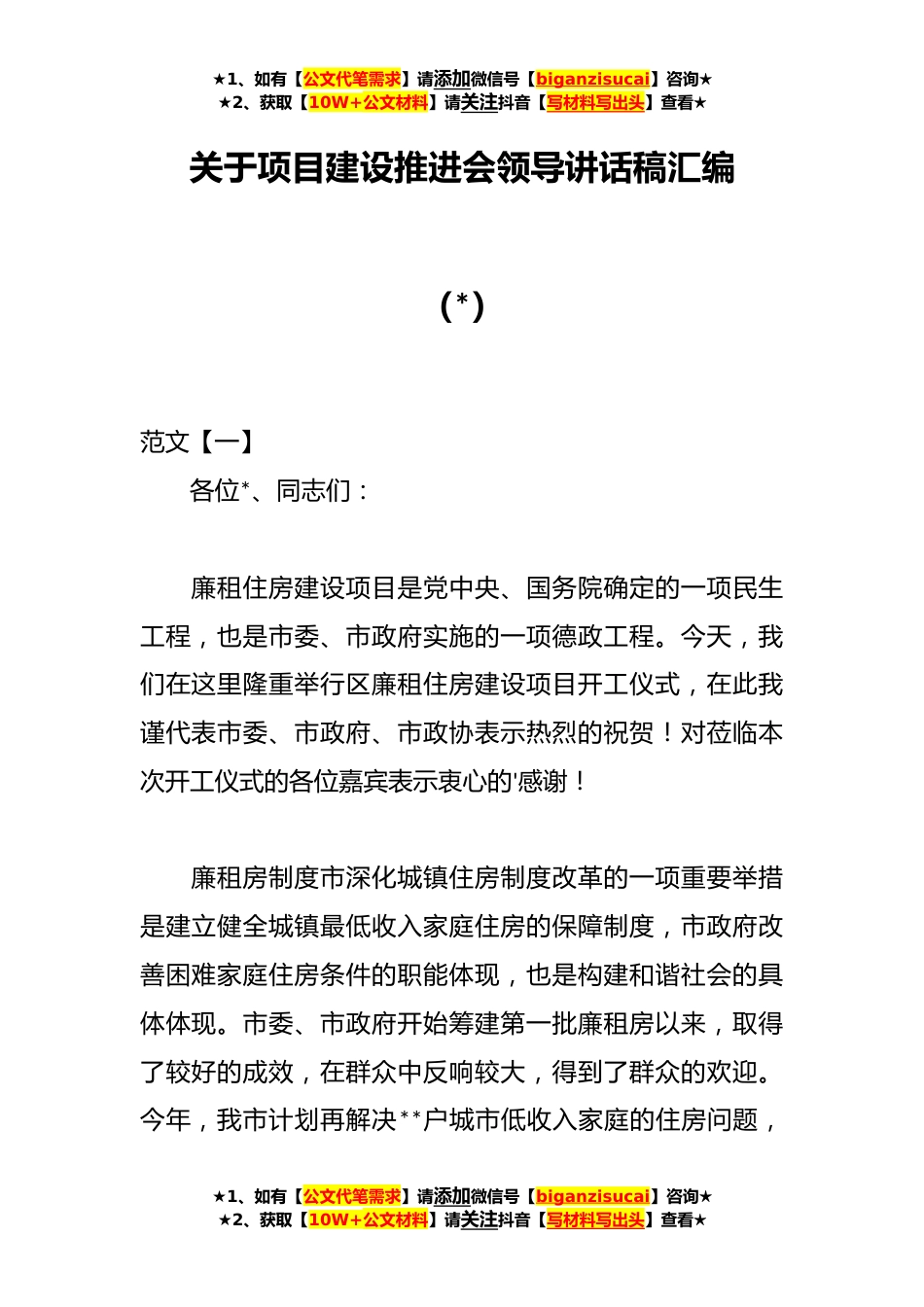 ★1、如有【公文代笔需求】请添加微信号【biganzisucai】咨询★★2、获取【10W+公文材料】请关注抖音【写材料写出头】查看★关于项目建设推进会领导讲话稿汇编(*)范文【一】各位*、同志们:廉租住房建设项目是党中央、国务院确定的一项民生工程,也是市委、市政府实施的一项德政工程。今天,我们在这里隆重举行区廉租住房建设项目开工仪式,在此我谨代表市委、市政府、市政协表示热烈的祝贺!对莅临本次开工仪式的各位嘉宾表示衷心的'感谢!廉租房制度市深化城镇住房制度改革的一项重要举措是建立健全城镇最低收入家庭住房的保障制度,市政府改善困难家庭住房条件的职能体现,也是构建和谐社会的具体体现。市委、市政府开始筹建第一批廉租房以来,取得了较好的成效,在群众中反响较大,得到了群众的欢迎。今年,...