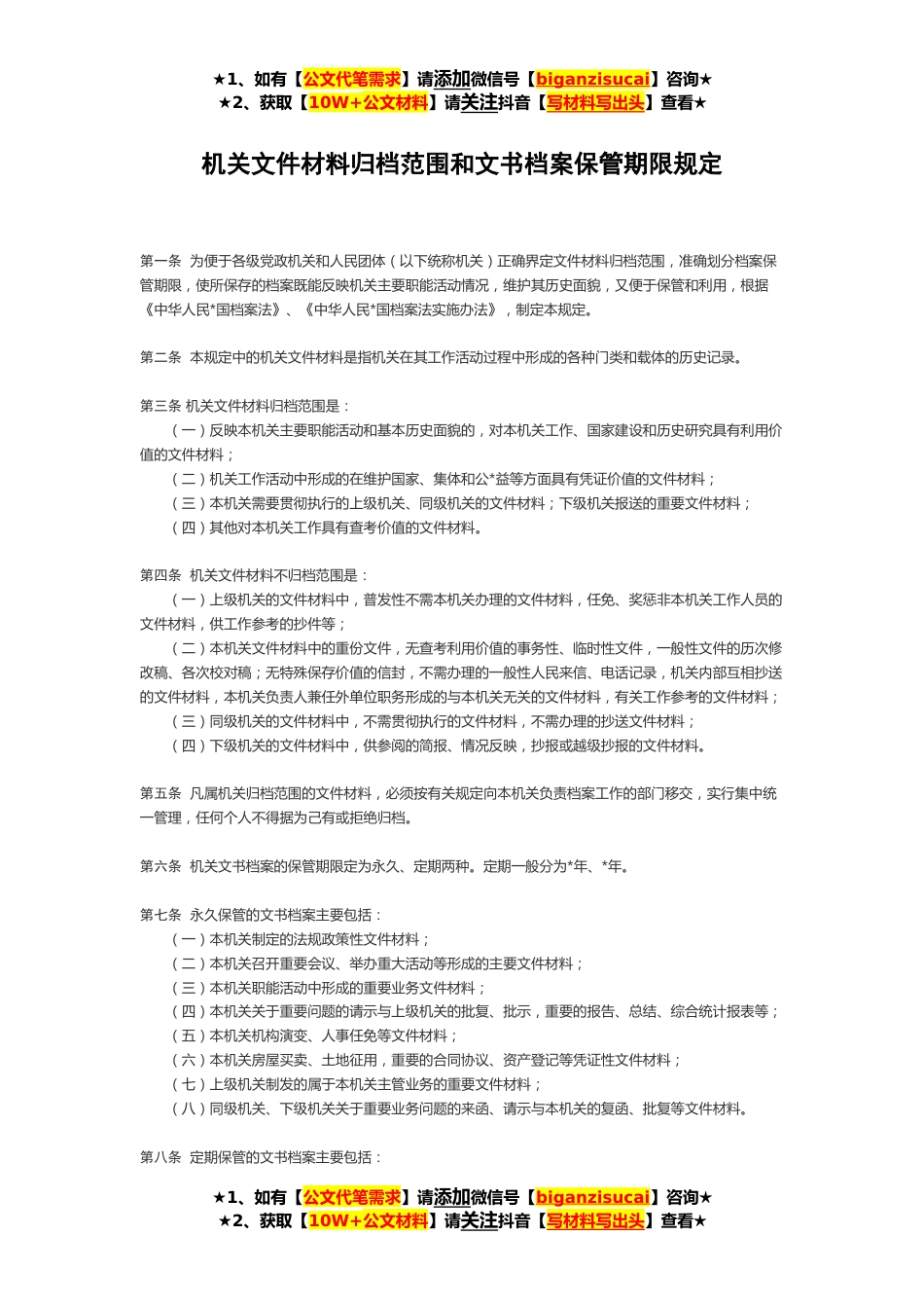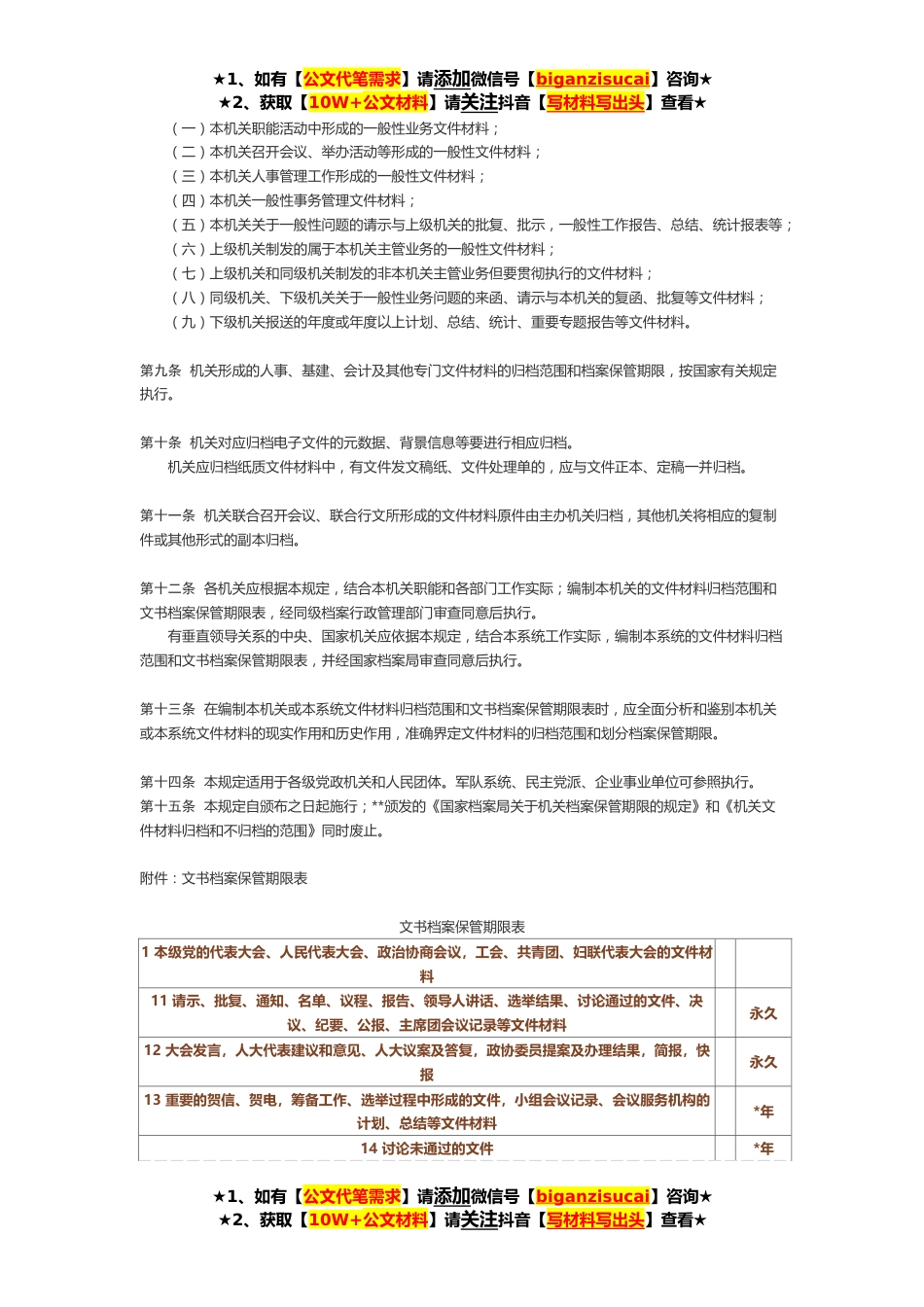 ★1、如有【公文代笔需求】请添加微信号【biganzisucai】咨询★★2、获取【10W+公文材料】请关注抖音【写材料写出头】查看★机关文件材料归档范围和文书档案保管期限规定第一条为便于各级党政机关和人民团体(以下统称机关)正确界定文件材料归档范围,准确划分档案保管期限,使所保存的档案既能反映机关主要职能活动情况,维护其历史面貌,又便于保管和利用,根据《中华人民*国档案法》、《中华人民*国档案法实施办法》,制定本规定。第二条本规定中的机关文件材料是指机关在其工作活动过程中形成的各种门类和载体的历史记录。第三条机关文件材料归档范围是:(一)反映本机关主要职能活动和基本历史面貌的,对本机关工作、国家建设和历史研究具有利用价值的文件材料;(二)机关工作活动中形成的在维护国家、集...