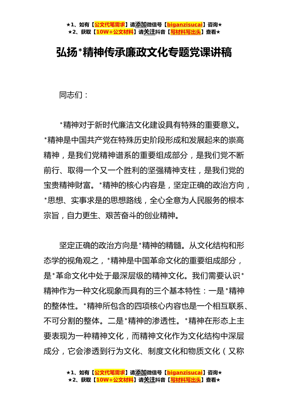 ★1、如有【公文代笔需求】请添加微信号【biganzisucai】咨询★★2、获取【10W+公文材料】请关注抖音【写材料写出头】查看★弘扬*精神传承廉政文化专题党课讲稿同志们:*精神对于新时代廉洁文化建设具有特殊的重要意义。*精神是中国共产党在特殊历史阶段形成和发展起来的崇高精神,是我们党精神谱系的重要组成部分,是我们党不断前行、取得一个又一个胜利的坚强精神支柱,是我们党的宝贵精神财富。*精神的核心内容是,坚定正确的政治方向,*思想、实事求是的思想路线,全心全意为人民服务的根本宗旨,自力更生、艰苦奋斗的创业精神。坚定正确的政治方向是*精神的精髓。从文化结构和形态学的视角观之,*精神是中国革命文化的重要组成部分,是*革命文化中处于最深层级的精神文化。我们需要认识*精神作为一种文化现象...