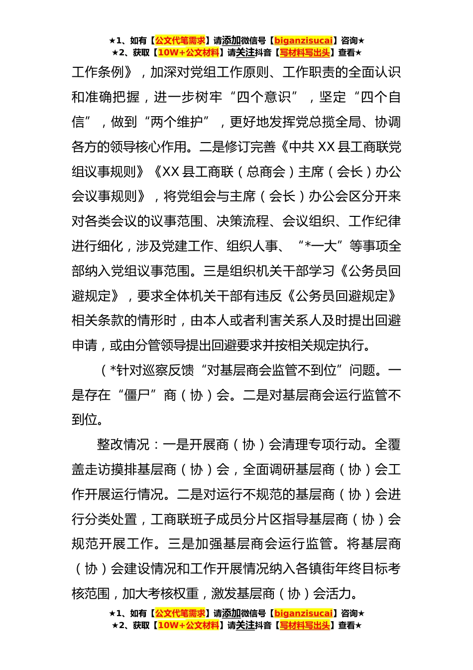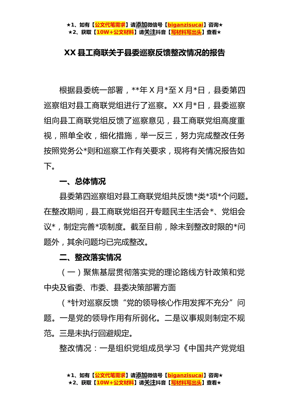 ★1、如有【公文代笔需求】请添加微信号【biganzisucai】咨询★★2、获取【10W+公文材料】请关注抖音【写材料写出头】查看★XX县工商联关于县委巡察反馈整改情况的报告根据县委统一部署,**年X月*至X月*日,县委第四巡察组对县工商联党组进行了巡察。XX月*日,县委巡察组向县工商联党组反馈了巡察意见,县工商联党组高度重视,照单全收,细化措施,举一反三,努力完成整改任务按照党务公*则和巡察工作有关要求,现将有关情况报告如下。一、总体情况县委第四巡察组对县工商联党组共反馈*类*项*个问题。在整改期间,县工商联党组召开专题民主生活会*、党组会议*,制定完善*项制度。截至目前,除未到整改时限的*问题外,其余问题均已完成整改。二、整改落实情况(一)聚焦基层贯彻落实党的理论路线方针政策和党中央及...