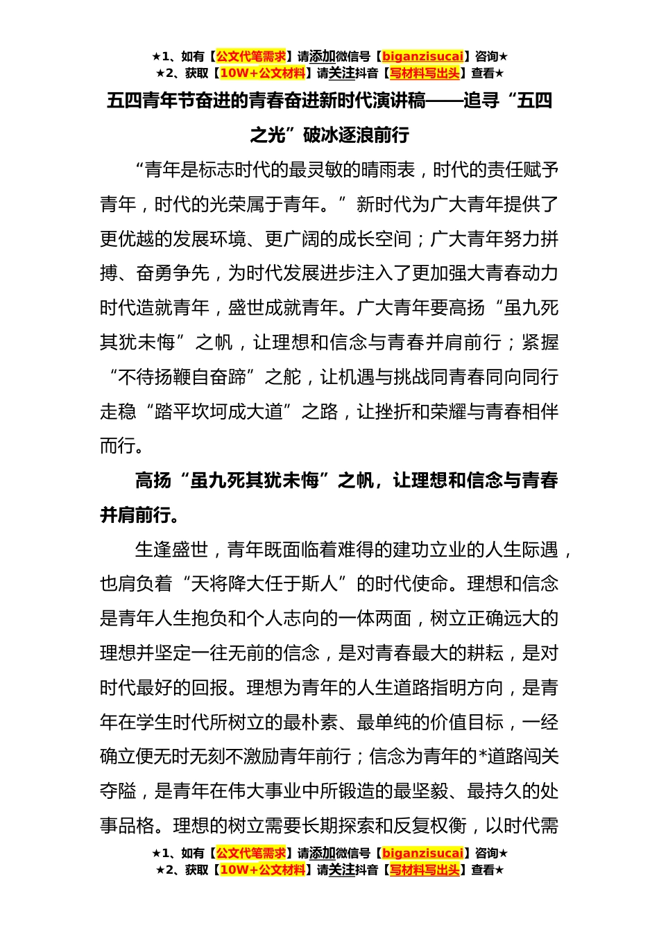 ★1、如有【公文代笔需求】请添加微信号【biganzisucai】咨询★★2、获取【10W+公文材料】请关注抖音【写材料写出头】查看★五四青年节奋进的青春奋进新时代演讲稿——追寻“五四之光”破冰逐浪前行“青年是标志时代的最灵敏的晴雨表,时代的责任赋予青年,时代的光荣属于青年。”新时代为广大青年提供了更优越的发展环境、更广阔的成长空间;广大青年努力拼搏、奋勇争先,为时代发展进步注入了更加强大青春动力时代造就青年,盛世成就青年。广大青年要高扬“虽九死其犹未悔”之帆,让理想和信念与青春并肩前行;紧握“不待扬鞭自奋蹄”之舵,让机遇与挑战同青春同向同行走稳“踏平坎坷成大道”之路,让挫折和荣耀与青春相伴而行。高扬“虽九死其犹未悔”之帆,让理想和信念与青春并肩前行。生逢盛世,青年既面临...