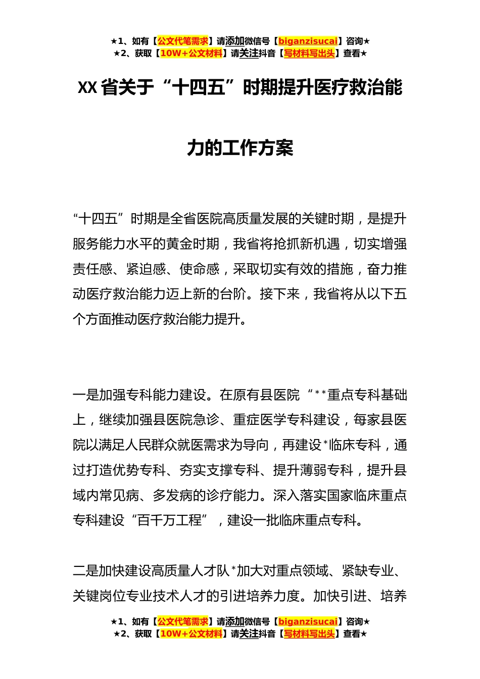 ★1、如有【公文代笔需求】请添加微信号【biganzisucai】咨询★★2、获取【10W+公文材料】请关注抖音【写材料写出头】查看★XX省关于“十四五”时期提升医疗救治能力的工作方案“十四五”时期是全省医院高质量发展的关键时期,是提升服务能力水平的黄金时期,我省将抢抓新机遇,切实增强责任感、紧迫感、使命感,采取切实有效的措施,奋力推动医疗救治能力迈上新的台阶。接下来,我省将从以下五个方面推动医疗救治能力提升。一是加强专科能力建设。在原有县医院“**重点专科基础上,继续加强县医院急诊、重症医学专科建设,每家县医院以满足人民群众就医需求为导向,再建设*临床专科,通过打造优势专科、夯实支撑专科、提升薄弱专科,提升县域内常见病、多发病的诊疗能力。深入落实国家临床重点专科建设“百千万工...