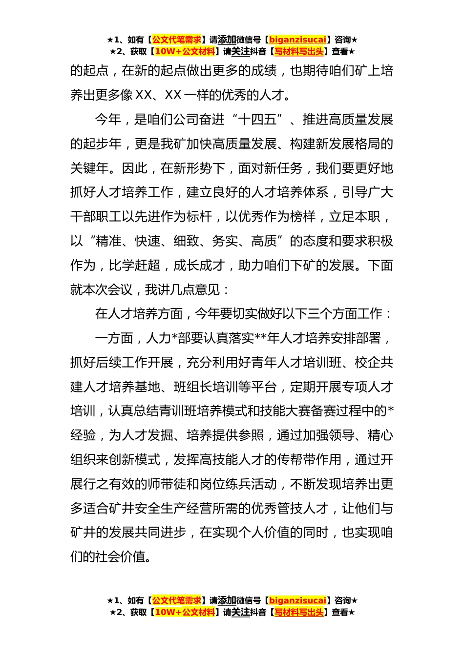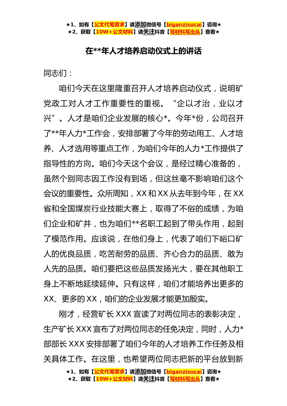 ★1、如有【公文代笔需求】请添加微信号【biganzisucai】咨询★★2、获取【10W+公文材料】请关注抖音【写材料写出头】查看★在**年人才培养启动仪式上的讲话同志们:咱们今天在这里隆重召开人才培养启动仪式,说明矿党政工对人才工作重要性的重视。“企以才治,业以才兴”。人才是咱们企业发展的核心*。今年*份,公司召开了**年人力*工作会,安排部署了今年的劳动用工、人才培养、人才选用等重点工作,为咱们今年的人力*工作提供了指导性的方向。咱们今天这个会议,是经过精心准备的,虽然个别同志因工作没有到场,但这丝毫不影响咱们这个会议的重要性。众所周知,XX和XX从去年到今年,在XX省和全国煤炭行业技能大赛上,取得了不俗的成绩,为咱们企业和矿井,也为咱们**名职工起到了带头作用,起到了模范作用。应...
