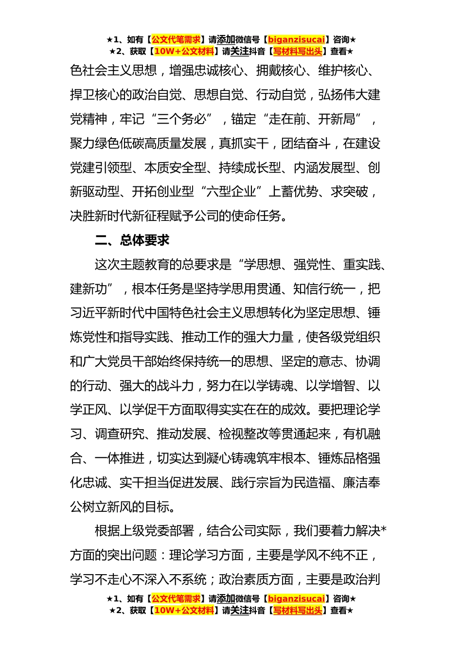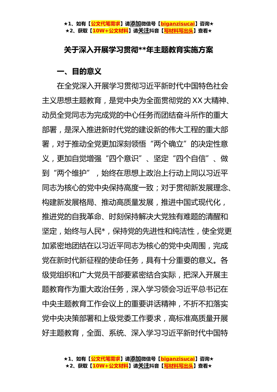 ★1、如有【公文代笔需求】请添加微信号【biganzisucai】咨询★★2、获取【10W+公文材料】请关注抖音【写材料写出头】查看★关于深入开展学习贯彻**年主题教育实施方案一、目的意义在全党深入开展学习贯彻习近平新时代中国特色社会主义思想主题教育,是党中央为全面贯彻党的XX大精神、动员全党同志为完成党的中心任务而团结奋斗所作的重大部署,是深入推进新时代党的建设新的伟大工程的重大部署,对于推动全党更加深刻领悟“两个确立”的决定性意义,更加自觉增强“四个意识”、坚定“四个自信”、做到“两个维护”,始终在思想上政治上行动上同以习近平同志为核心的党中央保持高度一致;对于贯彻新发展理念、构建新发展格局、推动高质量发展,推进中国式现代化,推进党的自我革命、时刻保持解决大党独有难题的清...