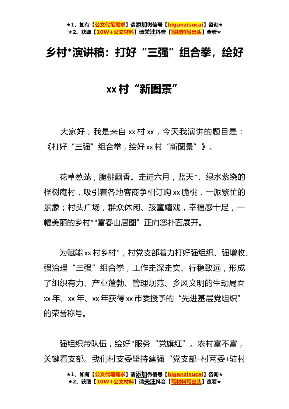 ★1、如有【公文代笔需求】请添加微信号【biganzisucai】咨询★★2、获取【10W+公文材料】请关注抖音【写材料写出头】查看★乡村*演讲稿:打好“三强”组合拳,绘好xx村“新图景”大家好,我是来自xx村xx,今天我演讲的题目是:《打好“三强”组合拳,绘好xx村“新图景”》。花草葱茏,脆桃飘香。走进六月,蓝天*、绿水萦绕的柽树庵村,吸引着各地客商争相订购xx脆桃,一派繁忙的景象;村头广场,群众休闲、孩童嬉戏,幸福感十足,一幅美丽的乡村*“富春山居图”正向您扑面展开。为赋能xx村乡村*,村党支部着力打好强组织、强增收、强治理“三强”组合拳,工作走深走实、行稳致远,形成了组织有力、产业蓬勃、管理规范、乡风文明的生动局面xx年、xx年、xx年获得xx市委授予的“先进基层党组织”的荣誉称号。强组织...