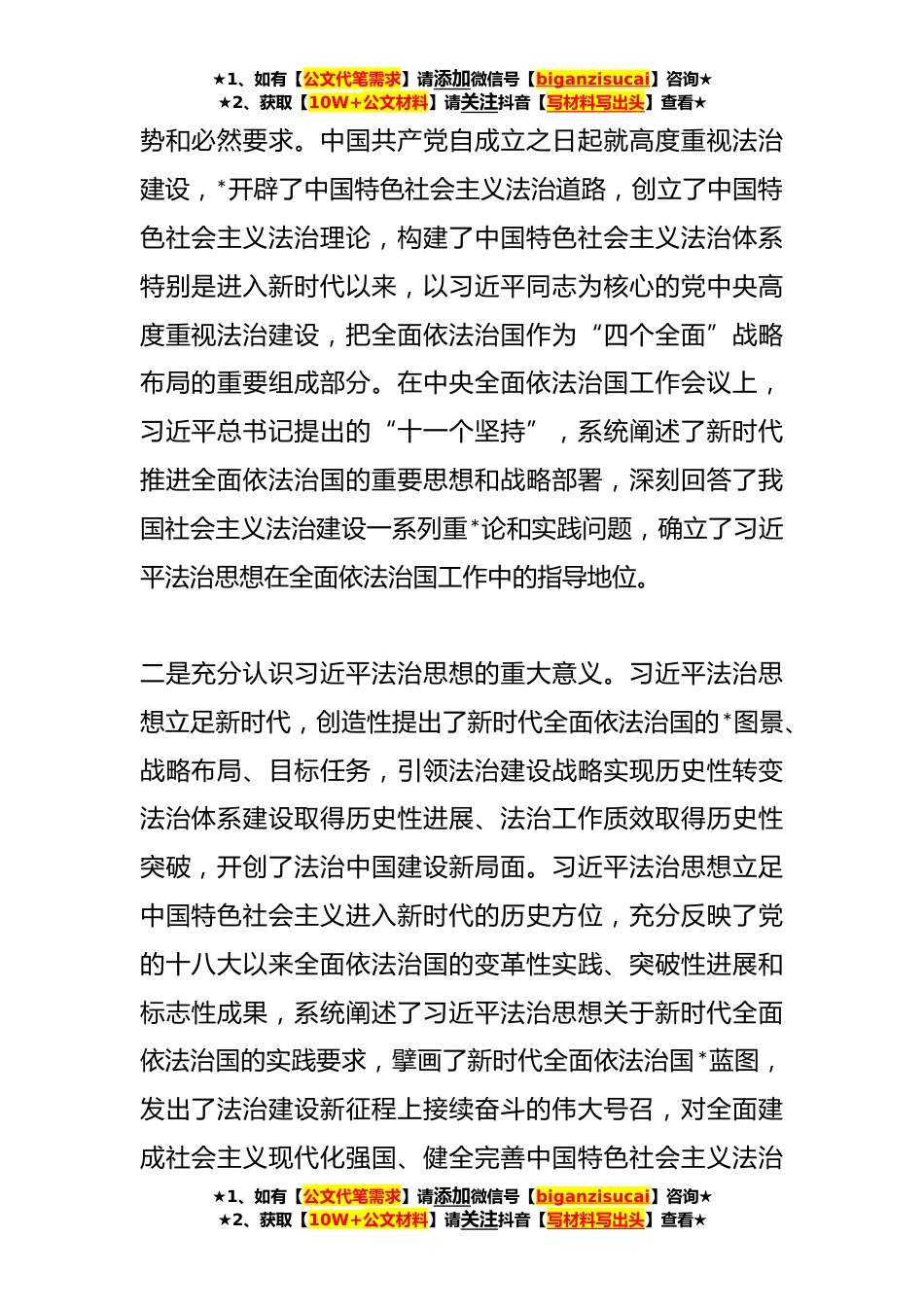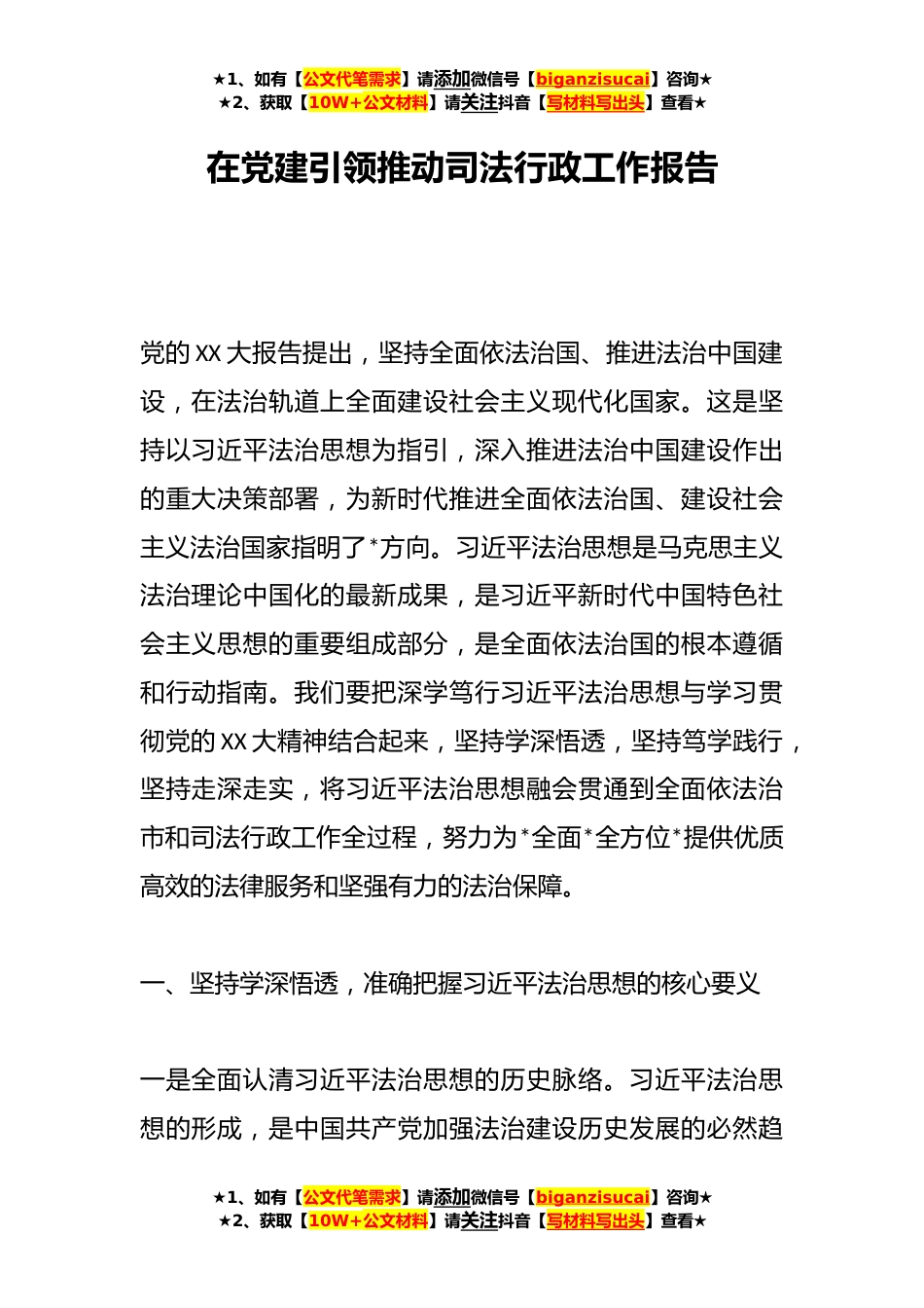 ★1、如有【公文代笔需求】请添加微信号【biganzisucai】咨询★★2、获取【10W+公文材料】请关注抖音【写材料写出头】查看★在党建引领推动司法行政工作报告党的XX大报告提出,坚持全面依法治国、推进法治中国建设,在法治轨道上全面建设社会主义现代化国家。这是坚持以习近平法治思想为指引,深入推进法治中国建设作出的重大决策部署,为新时代推进全面依法治国、建设社会主义法治国家指明了*方向。习近平法治思想是马克思主义法治理论中国化的最新成果,是习近平新时代中国特色社会主义思想的重要组成部分,是全面依法治国的根本遵循和行动指南。我们要把深学笃行习近平法治思想与学习贯彻党的XX大精神结合起来,坚持学深悟透,坚持笃学践行,坚持走深走实,将习近平法治思想融会贯通到全面依法治市和司法行政工...