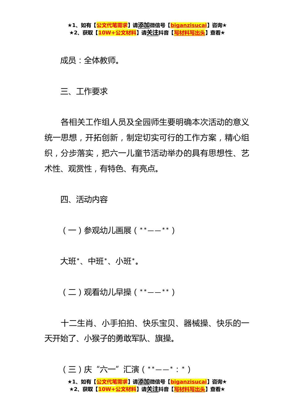 ★1、如有【公文代笔需求】请添加微信号【biganzisucai】咨询★★2、获取【10W+公文材料】请关注抖音【写材料写出头】查看★关于六一儿童节的活动策划方案(*)篇【一】为了更好地让孩子们在自己的盛大节日里,留下一个愉快、难忘的回忆,今年我园的“六一”儿童节将以开展系列庆祝活动的形式来进行,方案如下:一、活动宗旨幼儿园是孩子们快乐的天地,孩子将会在幼儿园度过快乐的童年,做快乐孩子,做快乐家长,做快乐老师!二、组织机构组长:园长。副组长:副园长。★1、如有【公文代笔需求】请添加微信号【biganzisucai】咨询★★2、获取【10W+公文材料】请关注抖音【写材料写出头】查看★★1、如有【公文代笔需求】请添加微信号【biganzisucai】咨询★★2、获取【10W+公文材料】请关注抖音【写材料写出头】查...