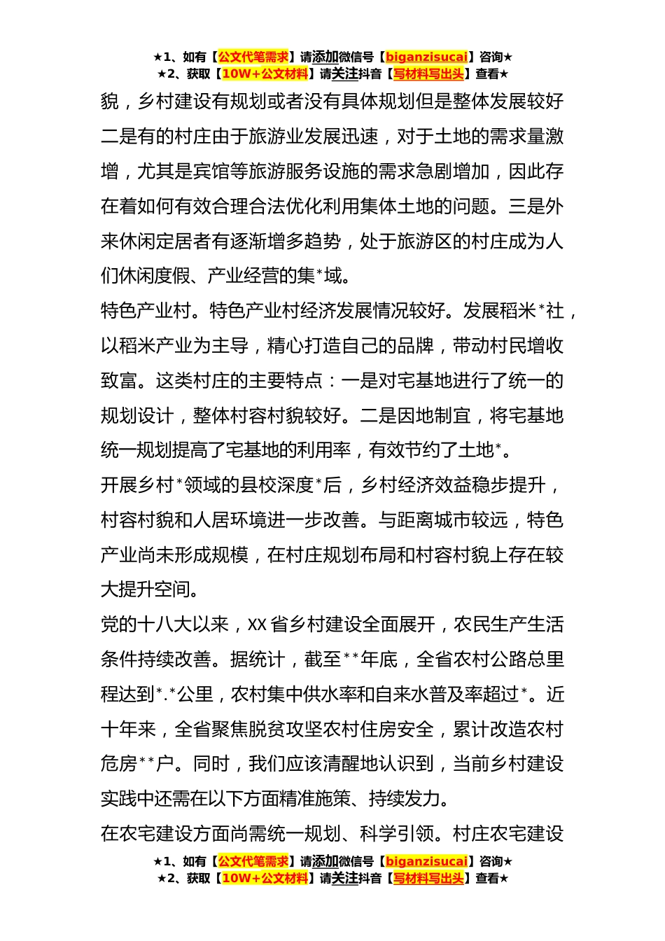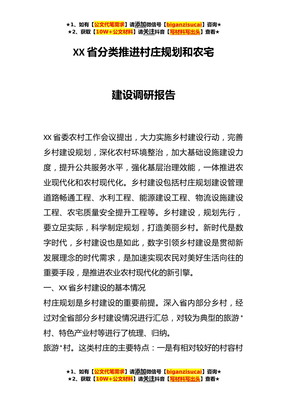★1、如有【公文代笔需求】请添加微信号【biganzisucai】咨询★★2、获取【10W+公文材料】请关注抖音【写材料写出头】查看★XX省分类推进村庄规划和农宅建设调研报告XX省委农村工作会议提出,大力实施乡村建设行动,完善乡村建设规划,深化农村环境整治,加大基础设施建设力度,提升公共服务水平,强化基层治理效能,一体推进农业现代化和农村现代化。乡村建设包括村庄规划建设管理道路畅通工程、水利工程、能源建设工程、物流设施建设工程、农宅质量安全提升工程等。乡村建设,规划先行,要立足实际,科学制定规划,打造美丽乡村。新时代是数字时代,乡村建设也是如此,数字引领乡村建设是贯彻新发展理念的时代需求,是加速实现农民对美好生活向往的重要手段,是推进农业农村现代化的新引擎。一、XX省乡村建设的...