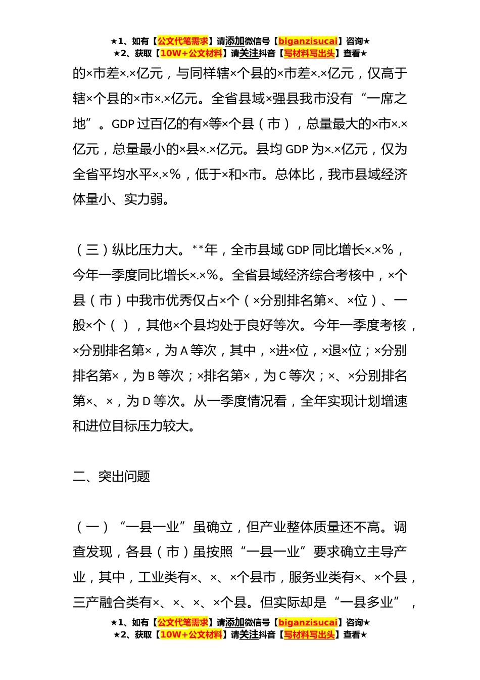 ★1、如有【公文代笔需求】请添加微信号【biganzisucai】咨询★★2、获取【10W+公文材料】请关注抖音【写材料写出头】查看★关于全市县域经济发展调查与研究县域经济是以县城为中心、集镇为纽带、农村为基础的区域经济。根据×省县域经济考核及监测评价办法,全省×个县(市)纳入县域经济范围,我市除×区外×个县(市)纳入县域经济范围。我市县域经济在全市经济总量中占比超六成,对全市经济发展具有举足轻重的作用,为进一步推动全市县域经济高质量发展,市发展研究中心组织专题调研形成如下报告。一、总体现状(一)县域占比重。**年,×个县(市)总面积×.×万平方公里,常住人口×.×万人,GDP总量×.×亿元,分别占全市×.×%、×.×%、×.×%,同比高出全省×.×个百分点、×.×个百分点、×.×个百...