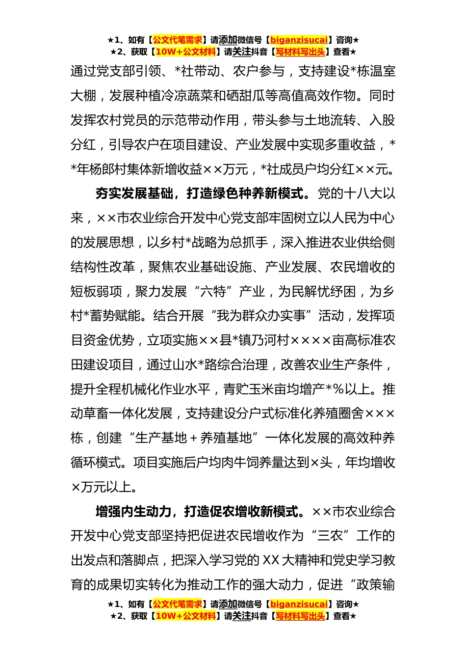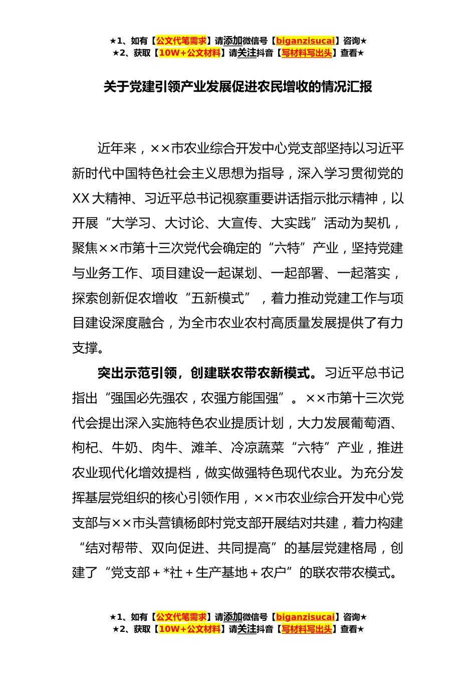 ★1、如有【公文代笔需求】请添加微信号【biganzisucai】咨询★★2、获取【10W+公文材料】请关注抖音【写材料写出头】查看★关于党建引领产业发展促进农民增收的情况汇报近年来,××市农业综合开发中心党支部坚持以习近平新时代中国特色社会主义思想为指导,深入学习贯彻党的XX大精神、习近平总书记视察重要讲话指示批示精神,以开展“大学习、大讨论、大宣传、大实践”活动为契机,聚焦××市第十三次党代会确定的“六特”产业,坚持党建与业务工作、项目建设一起谋划、一起部署、一起落实,探索创新促农增收“五新模式”,着力推动党建工作与项目建设深度融合,为全市农业农村高质量发展提供了有力支撑。突出示范引领,创建联农带农新模式。习近平总书记指出“强国必先强农,农强方能国强”。××市第十三次党...