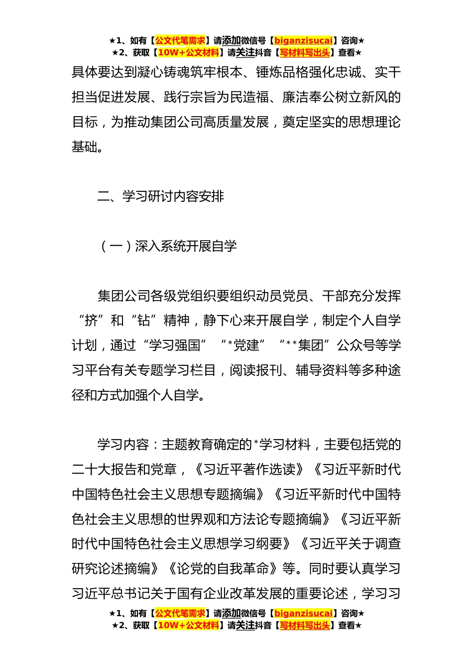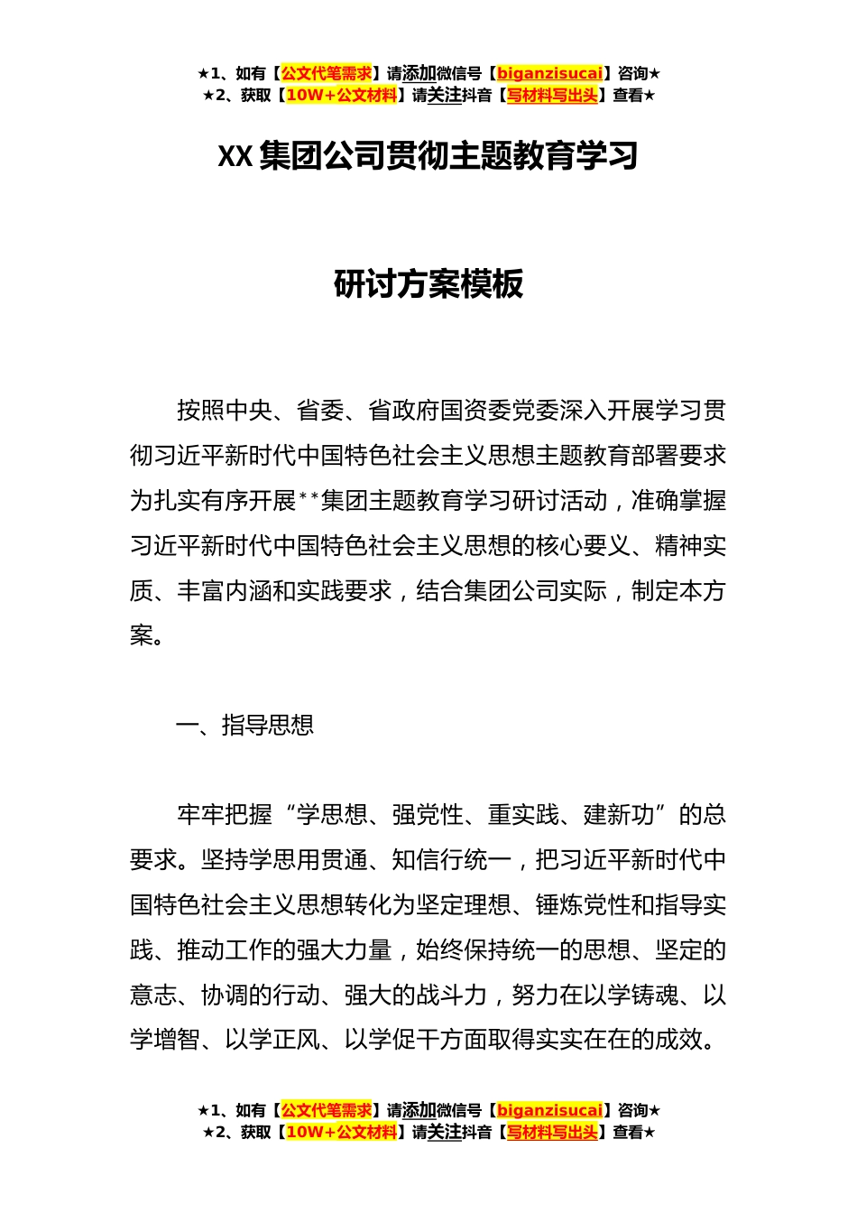 ★1、如有【公文代笔需求】请添加微信号【biganzisucai】咨询★★2、获取【10W+公文材料】请关注抖音【写材料写出头】查看★XX集团公司贯彻主题教育学习研讨方案模板按照中央、省委、省政府国资委党委深入开展学习贯彻习近平新时代中国特色社会主义思想主题教育部署要求为扎实有序开展**集团主题教育学习研讨活动,准确掌握习近平新时代中国特色社会主义思想的核心要义、精神实质、丰富内涵和实践要求,结合集团公司实际,制定本方案。一、指导思想牢牢把握“学思想、强党性、重实践、建新功”的总要求。坚持学思用贯通、知信行统一,把习近平新时代中国特色社会主义思想转化为坚定理想、锤炼党性和指导实践、推动工作的强大力量,始终保持统一的思想、坚定的意志、协调的行动、强大的战斗力,努力在以学铸魂、以...