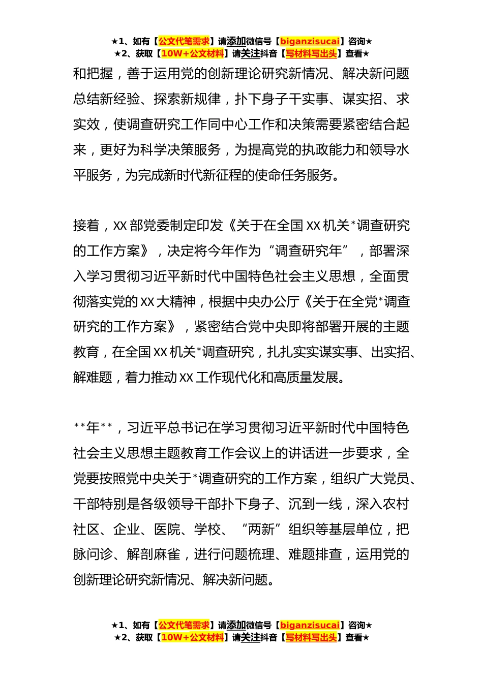 ★1、如有【公文代笔需求】请添加微信号【biganzisucai】咨询★★2、获取【10W+公文材料】请关注抖音【写材料写出头】查看★教育主题党课——调查研究要注意几个关键点根据我厅主题教育学习方案要求,今天由我给大家讲一堂党课。课的主题就是此次主题教育的重要内容之一如何开展调查研究,要注意那几个方面,如何通过调查研究来提升队*理和促进工作开展。一、调查研究的要求背景**日,中共中央办公厅印发了《关于在全党*调查研究的工作方案》。要求在全党*调查研究,要坚持以习近平新时代中国特色社会主义思想为指导,全面贯彻落实党的XX大精神,紧紧围绕党的理论和路线方针政策、党中央重大决策部署的贯彻执行,大力弘扬党的光荣传统和优良作风,突出问题导向和目标导向,促进广大党员、干部特别是领导干部带头深...