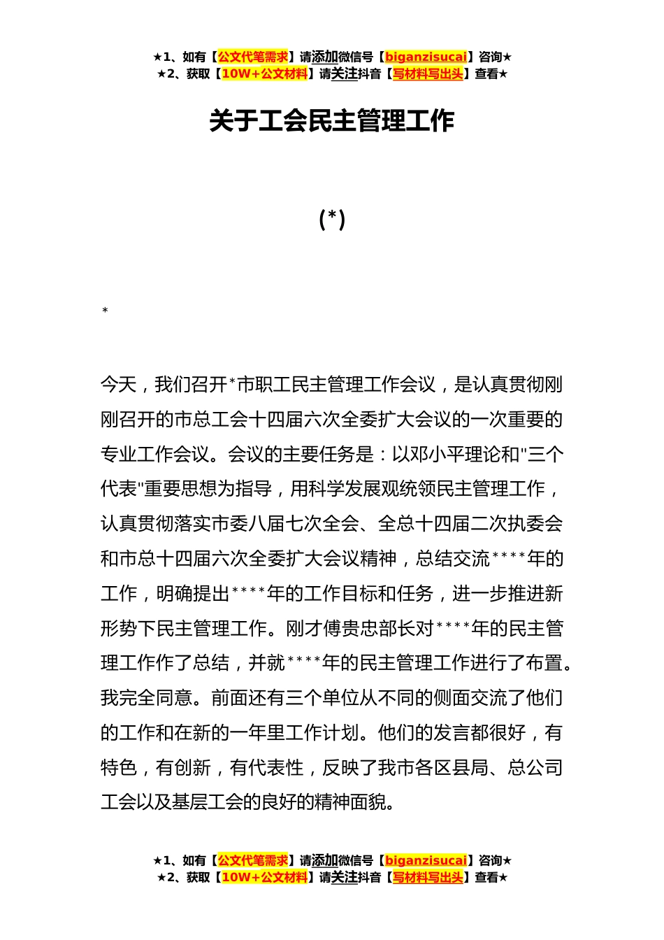 ★1、如有【公文代笔需求】请添加微信号【biganzisucai】咨询★★2、获取【10W+公文材料】请关注抖音【写材料写出头】查看★关于工会民主管理工作(*)*今天,我们召开*市职工民主管理工作会议,是认真贯彻刚刚召开的市总工会十四届六次全委扩大会议的一次重要的专业工作会议。会议的主要任务是:以邓小平理论和"三个代表"重要思想为指导,用科学发展观统领民主管理工作,认真贯彻落实市委八届七次全会、全总十四届二次执委会和市总十四届六次全委扩大会议精神,总结交流****年的工作,明确提出****年的工作目标和任务,进一步推进新形势下民主管理工作。刚才傅贵忠部长对****年的民主管理工作作了总结,并就****年的民主管理工作进行了布置。我完全同意。前面还有三个单位从不同的侧面交流了他们的工作和在新的一年...