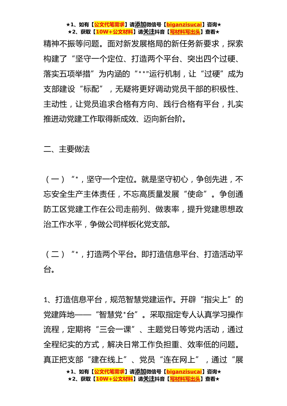 ★1、如有【公文代笔需求】请添加微信号【biganzisucai】咨询★★2、获取【10W+公文材料】请关注抖音【写材料写出头】查看★关于构建“**”运行机制,突出党建工作质效创建过硬党支部是落实全面从严治党重要举措,基于对党建工作标准化、规范化管理,亭南煤业公司通防工区党支部紧紧围绕“一通三防”工作主线,大力实施党建创新。通过构建“**”运行机制,不断提升自身建设工作水平,使党建工作与业务工作深入融合,有效夯实了基层党组织建设,促进了公司高质量发展。一、项目背景党支部是党的全部工作和战斗力的基础。如何把党支部建设好、作用发挥好?通防工区党支部坚持以问题为导向,积极探索解决因工作任务重,而忽视了党建工作不同步的问题;在落实制度建设工作中重业务轻党建,存在打折扣落实不到位的问题...
