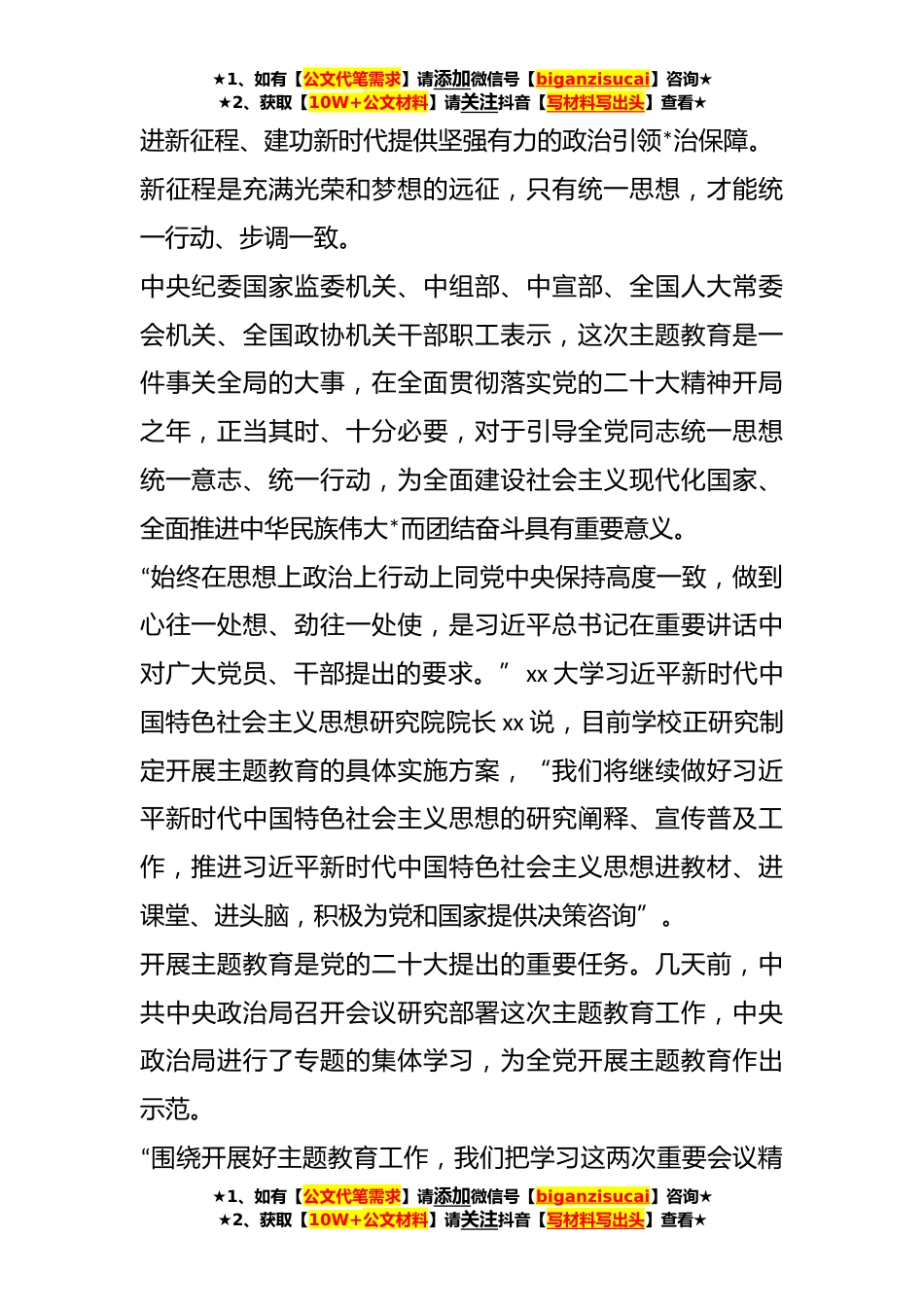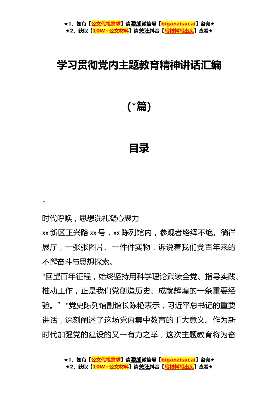 ★1、如有【公文代笔需求】请添加微信号【biganzisucai】咨询★★2、获取【10W+公文材料】请关注抖音【写材料写出头】查看★学习贯彻党内主题教育精神讲话汇编(*篇)目录*时代呼唤,思想洗礼凝心聚力xx新区正兴路xx号,xx陈列馆内,参观者络绎不绝。徜徉展厅,一张张图片、一件件实物,诉说着我们党百年来的不懈奋斗与思想探索。“回望百年征程,始终坚持用科学理论武装全党、指导实践、推动工作,正是我们党创造历史、成就辉煌的一条重要经验。”*党史陈列馆副馆长陈艳表示,习近平总书记的重要讲话,深刻阐述了这场党内集中教育的重大意义。作为新时代加强党的建设的又一有力之举,这次主题教育将为奋★1、如有【公文代笔需求】请添加微信号【biganzisucai】咨询★★2、获取【10W+公文材料】请关注抖音【写材料...