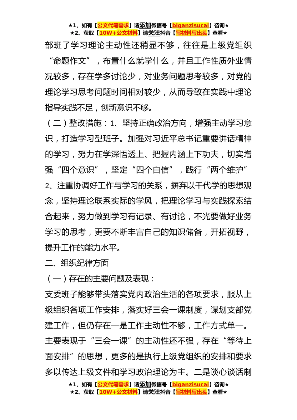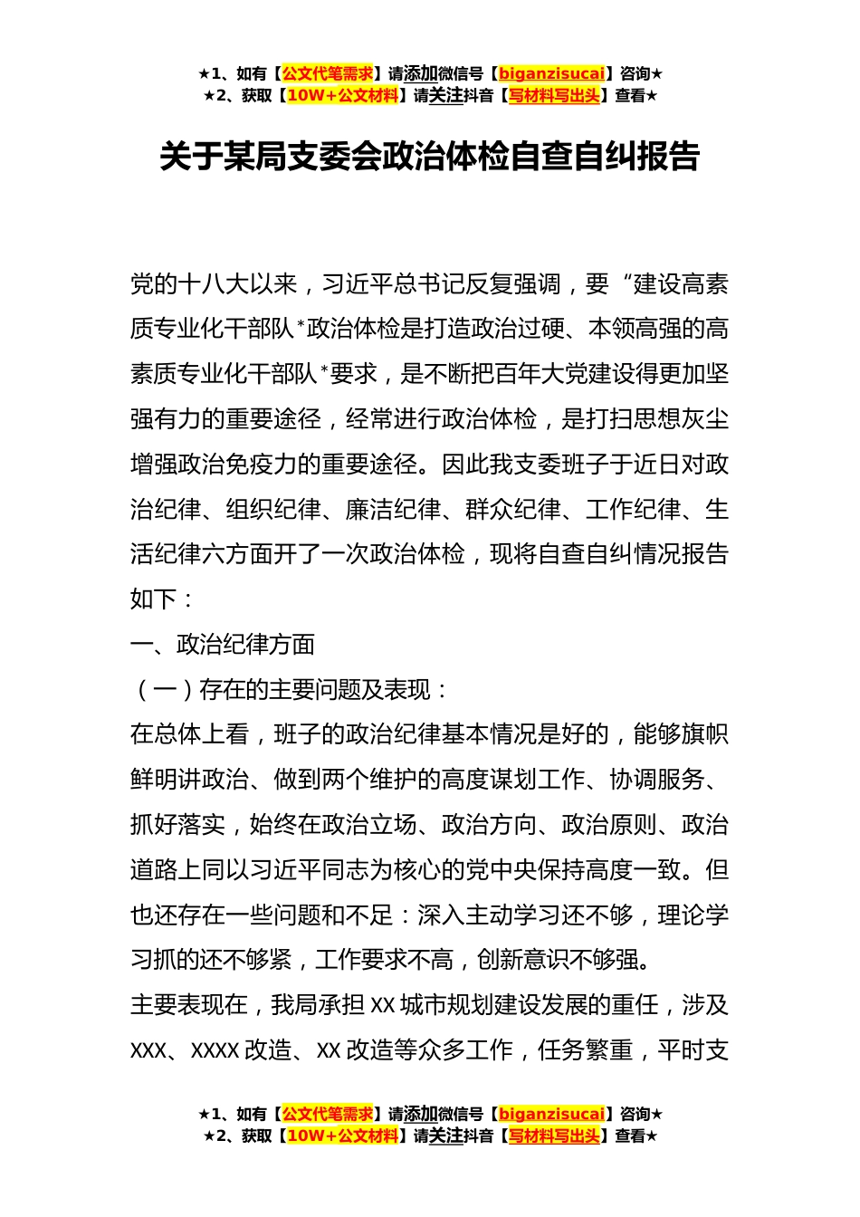 ★1、如有【公文代笔需求】请添加微信号【biganzisucai】咨询★★2、获取【10W+公文材料】请关注抖音【写材料写出头】查看★关于某局支委会政治体检自查自纠报告党的十八大以来,习近平总书记反复强调,要“建设高素质专业化干部队*政治体检是打造政治过硬、本领高强的高素质专业化干部队*要求,是不断把百年大党建设得更加坚强有力的重要途径,经常进行政治体检,是打扫思想灰尘增强政治免疫力的重要途径。因此我支委班子于近日对政治纪律、组织纪律、廉洁纪律、群众纪律、工作纪律、生活纪律六方面开了一次政治体检,现将自查自纠情况报告如下:一、政治纪律方面(一)存在的主要问题及表现:在总体上看,班子的政治纪律基本情况是好的,能够旗帜鲜明讲政治、做到两个维护的高度谋划工作、协调服务、抓好落实,...