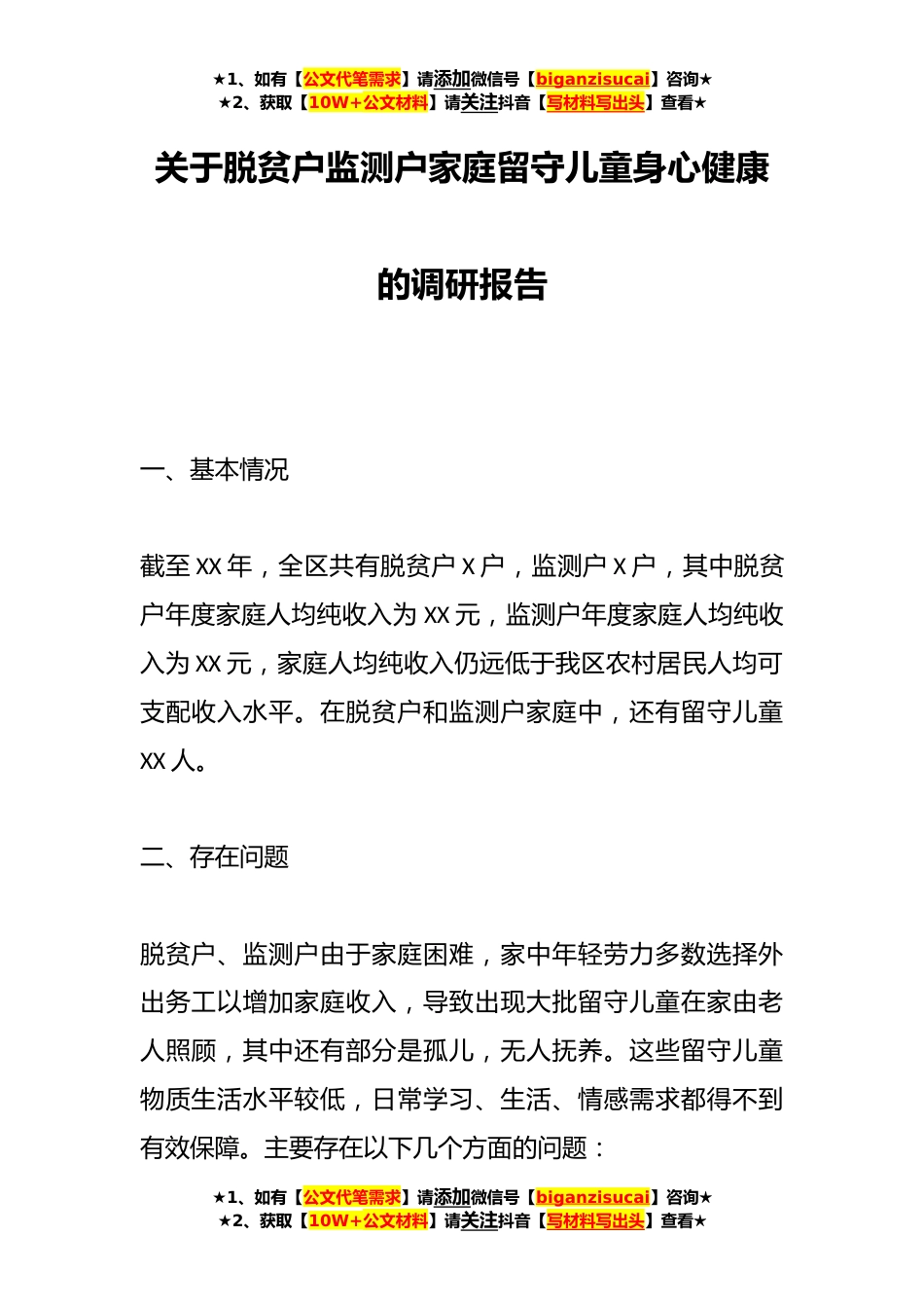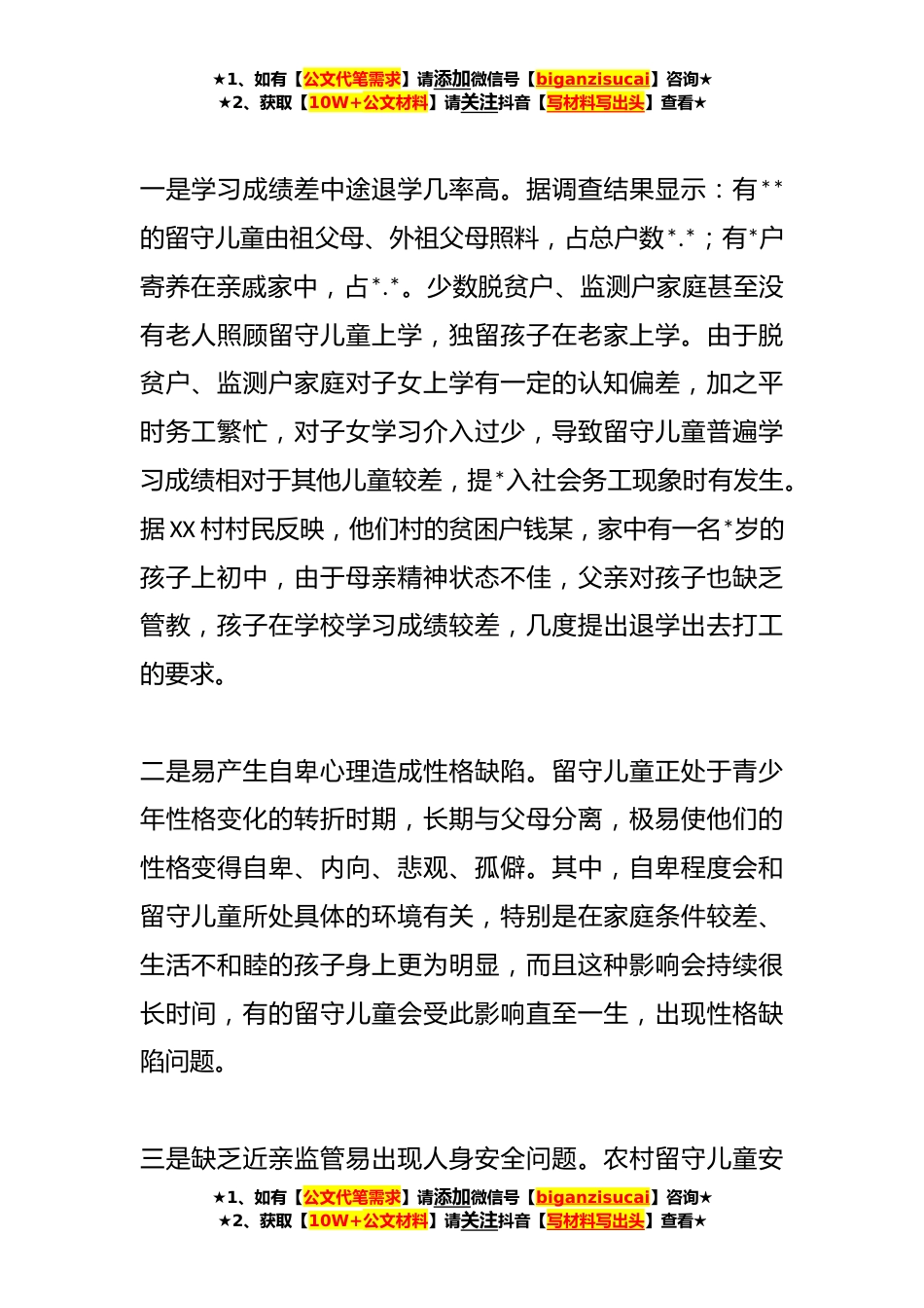 ★1、如有【公文代笔需求】请添加微信号【biganzisucai】咨询★★2、获取【10W+公文材料】请关注抖音【写材料写出头】查看★关于脱贫户监测户家庭留守儿童身心健康的调研报告一、基本情况截至XX年,全区共有脱贫户X户,监测户X户,其中脱贫户年度家庭人均纯收入为XX元,监测户年度家庭人均纯收入为XX元,家庭人均纯收入仍远低于我区农村居民人均可支配收入水平。在脱贫户和监测户家庭中,还有留守儿童XX人。二、存在问题脱贫户、监测户由于家庭困难,家中年轻劳力多数选择外出务工以增加家庭收入,导致出现大批留守儿童在家由老人照顾,其中还有部分是孤儿,无人抚养。这些留守儿童物质生活水平较低,日常学习、生活、情感需求都得不到有效保障。主要存在以下几个方面的问题:★1、如有【公文代笔需求】请添加微信...