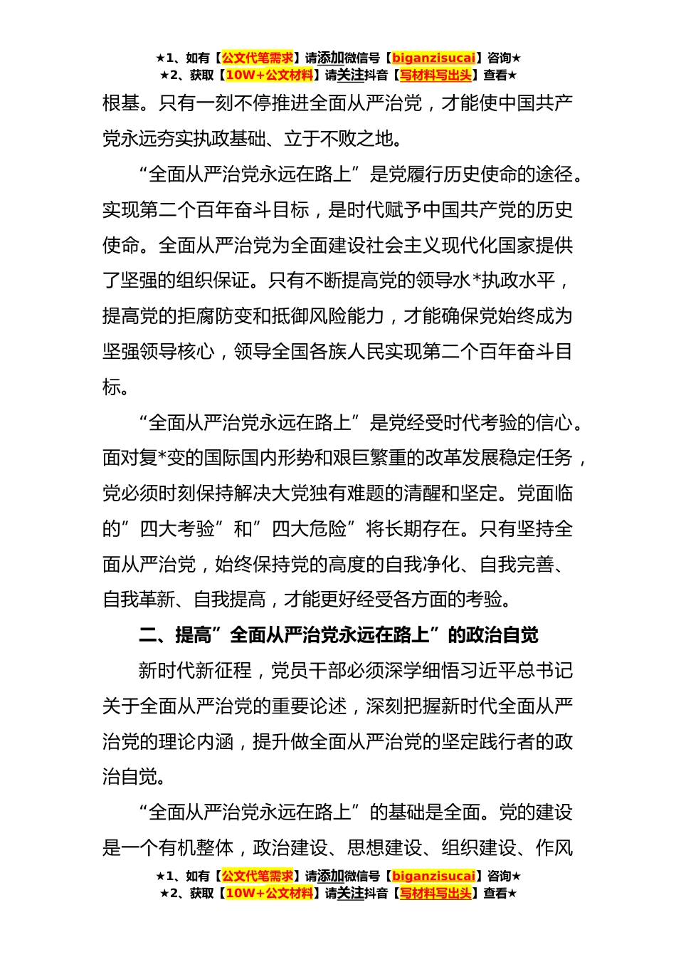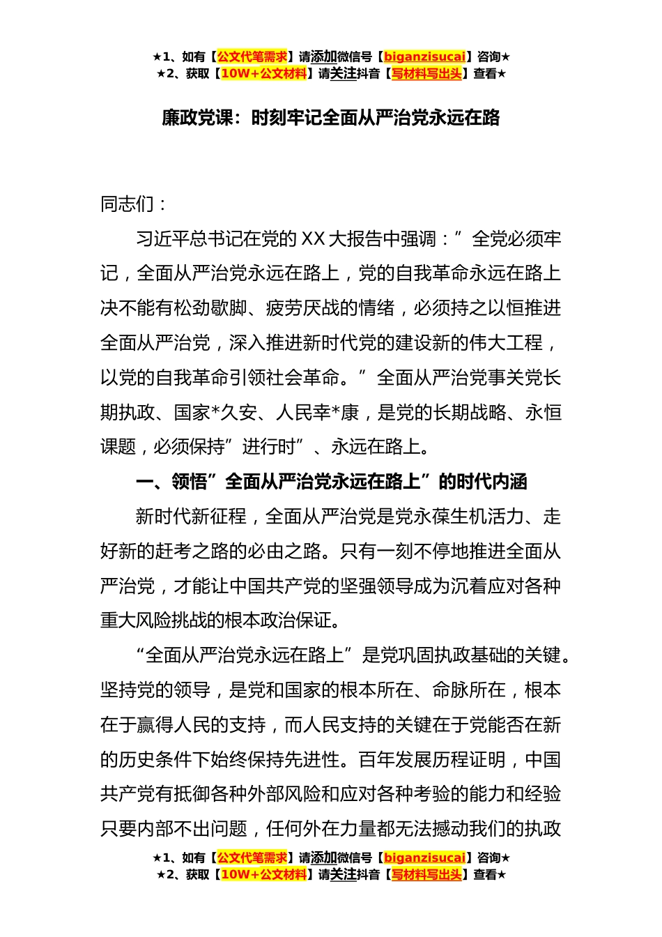 ★1、如有【公文代笔需求】请添加微信号【biganzisucai】咨询★★2、获取【10W+公文材料】请关注抖音【写材料写出头】查看★廉政党课:时刻牢记全面从严治党永远在路同志们:习近平总书记在党的XX大报告中强调:”全党必须牢记,全面从严治党永远在路上,党的自我革命永远在路上决不能有松劲歇脚、疲劳厌战的情绪,必须持之以恒推进全面从严治党,深入推进新时代党的建设新的伟大工程,以党的自我革命引领社会革命。”全面从严治党事关党长期执政、国家*久安、人民幸*康,是党的长期战略、永恒课题,必须保持”进行时”、永远在路上。一、领悟”全面从严治党永远在路上”的时代内涵新时代新征程,全面从严治党是党永葆生机活力、走好新的赶考之路的必由之路。只有一刻不停地推进全面从严治党,才能让中国共产党的...