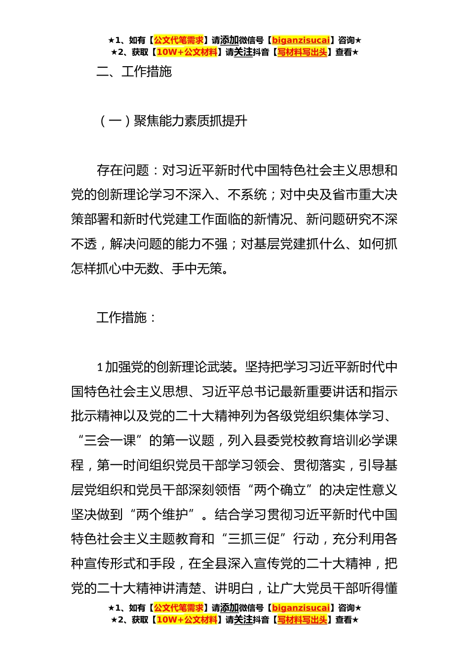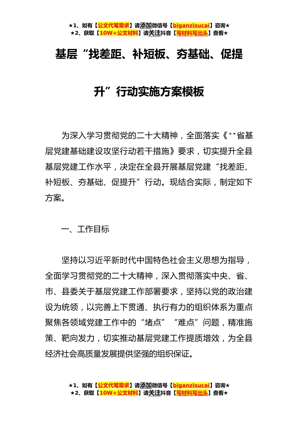 ★1、如有【公文代笔需求】请添加微信号【biganzisucai】咨询★★2、获取【10W+公文材料】请关注抖音【写材料写出头】查看★基层“找差距、补短板、夯基础、促提升”行动实施方案模板为深入学习贯彻党的二十大精神,全面落实《**省基层党建基础建设攻坚行动若干措施》要求,切实提升全县基层党建工作水平,决定在全县开展基层党建“找差距、补短板、夯基础、促提升”行动。现结合实际,制定如下方案。一、工作目标坚持以习近平新时代中国特色社会主义思想为指导,全面学习贯彻党的二十大精神,深入贯彻落实中央、省、市、县委关于基层党建工作部署要求,坚持以党的政治建设为统领,以完善上下贯通、执行有力的组织体系为重点聚焦各领域党建工作中的“堵点”“难点”问题,精准施策、靶向发力,切实推动基层党建工...