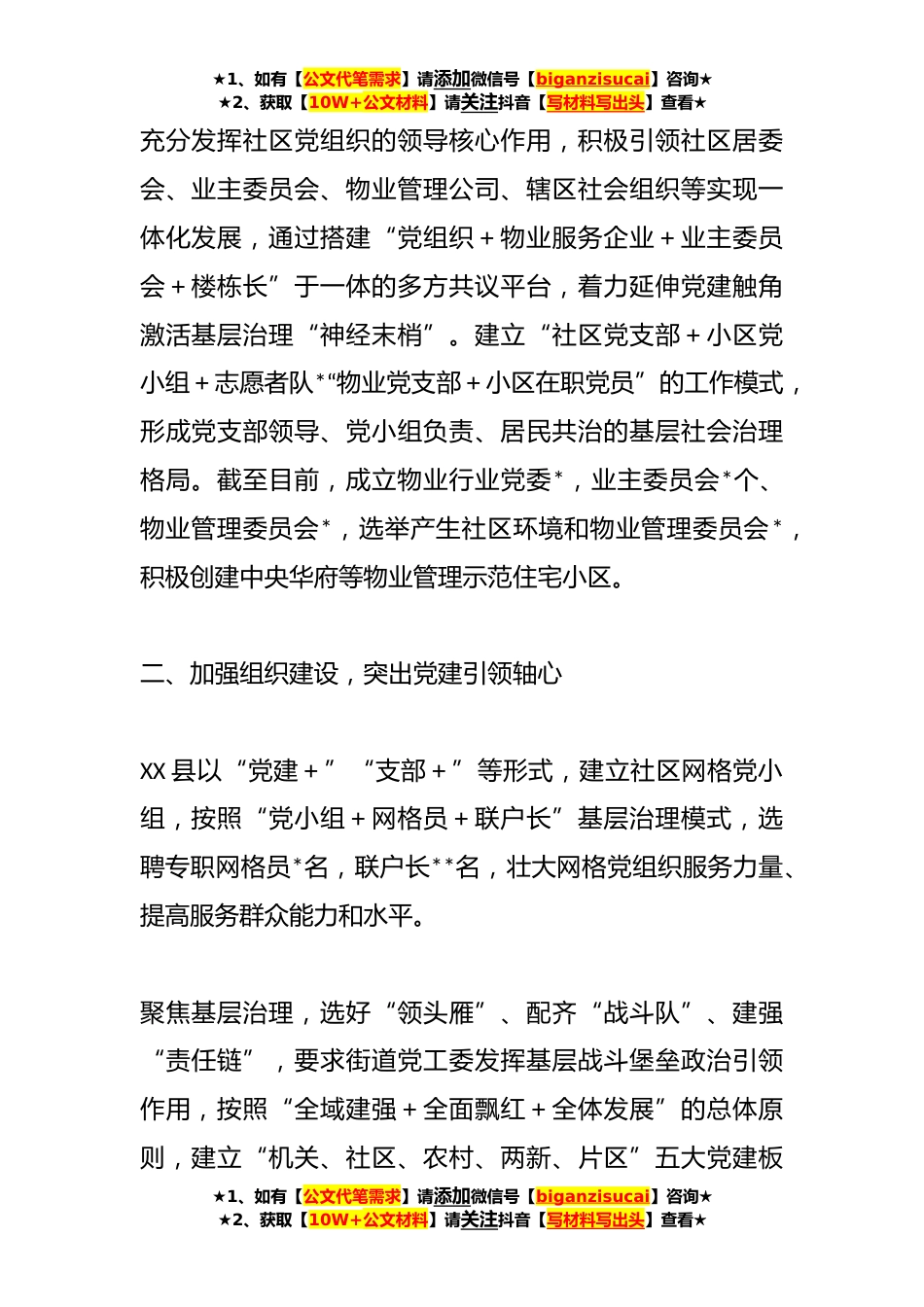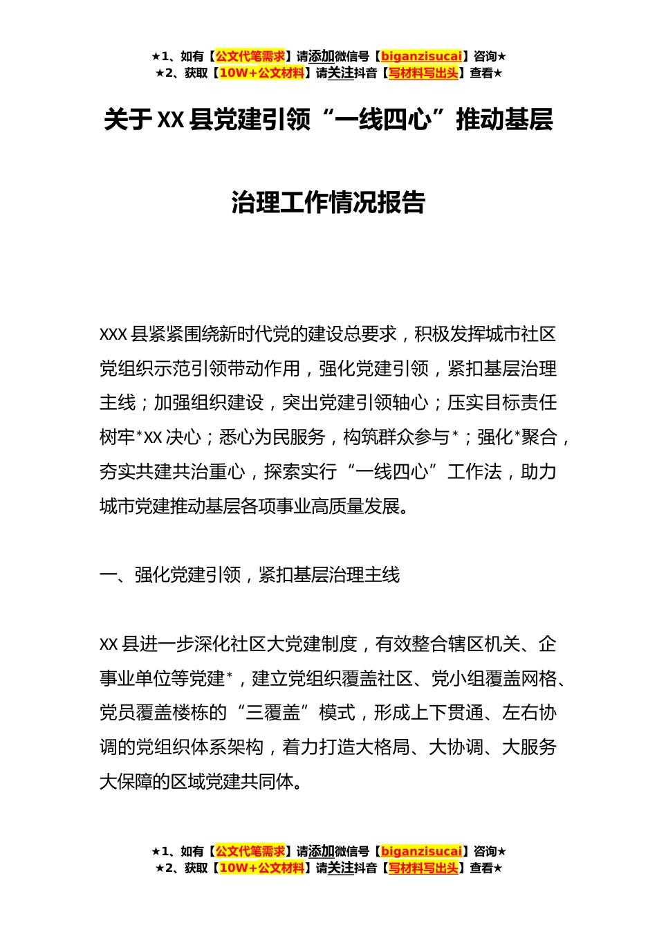 ★1、如有【公文代笔需求】请添加微信号【biganzisucai】咨询★★2、获取【10W+公文材料】请关注抖音【写材料写出头】查看★关于XX县党建引领“一线四心”推动基层治理工作情况报告XXX县紧紧围绕新时代党的建设总要求,积极发挥城市社区党组织示范引领带动作用,强化党建引领,紧扣基层治理主线;加强组织建设,突出党建引领轴心;压实目标责任树牢*XX决心;悉心为民服务,构筑群众参与*;强化*聚合,夯实共建共治重心,探索实行“一线四心”工作法,助力城市党建推动基层各项事业高质量发展。一、强化党建引领,紧扣基层治理主线XX县进一步深化社区大党建制度,有效整合辖区机关、企事业单位等党建*,建立党组织覆盖社区、党小组覆盖网格、党员覆盖楼栋的“三覆盖”模式,形成上下贯通、左右协调的党组织体系架构...